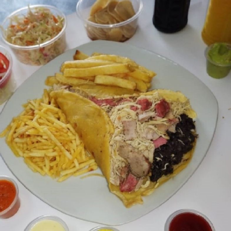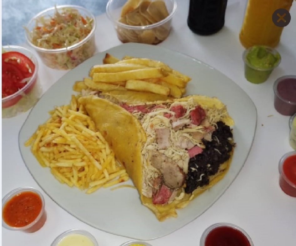 Taco en tortilla, frijolito negro, pollo, chorizo, pavo y lechón.