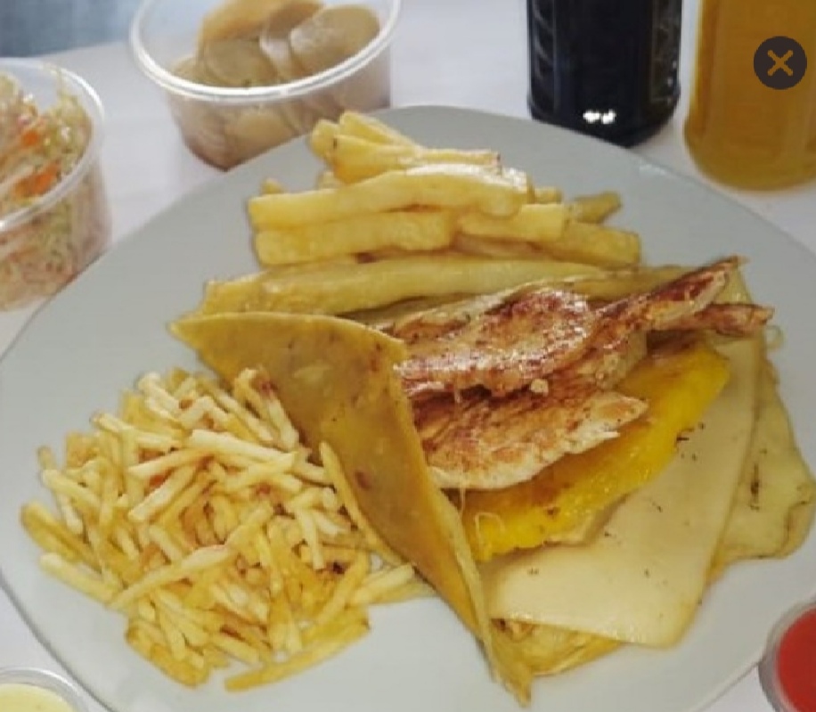 Enchilada en tortilla, queso, piña, filete de pollo y cremas a elección.
