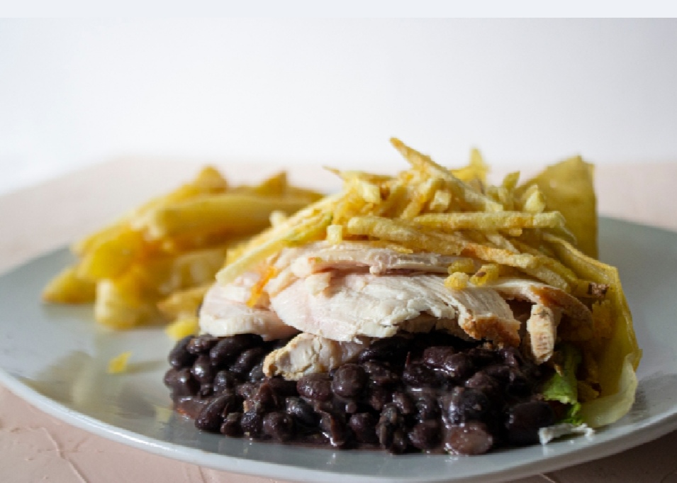 Taco en tortilla, frijolito negro, pollo y chorizo.