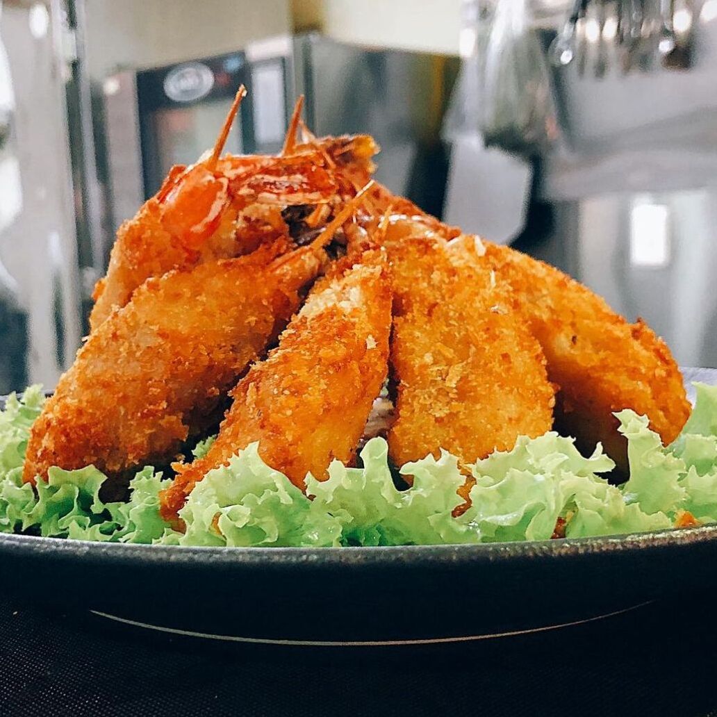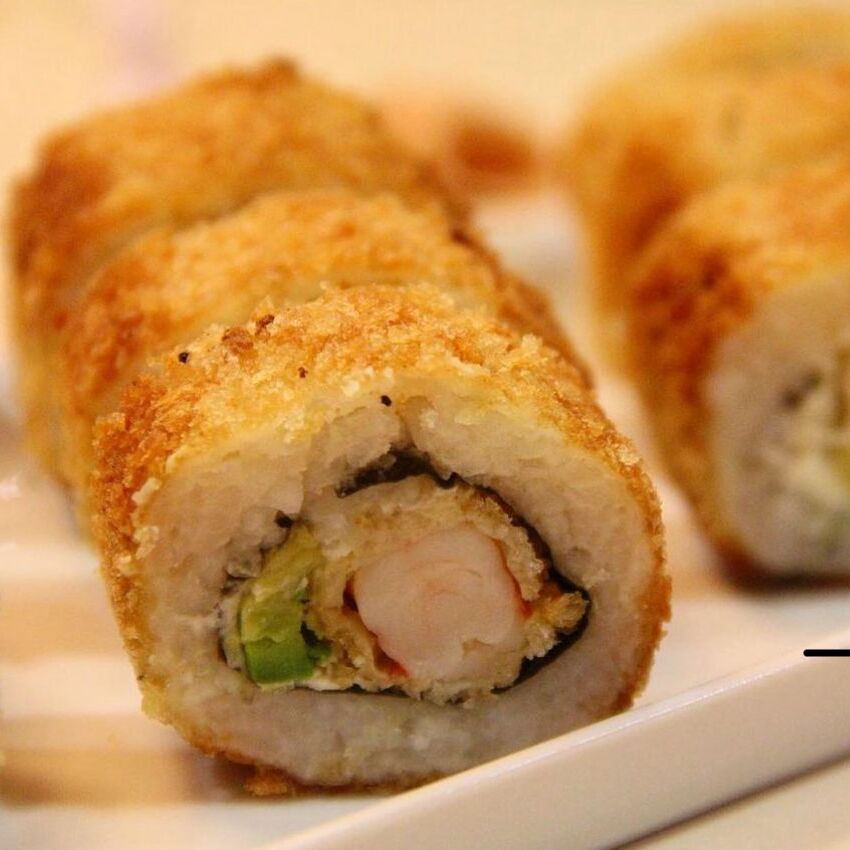 Rellenos de ebi furai con palta, cubierto de masa tempura y frito, acompañado de salsa de ajo más queso.