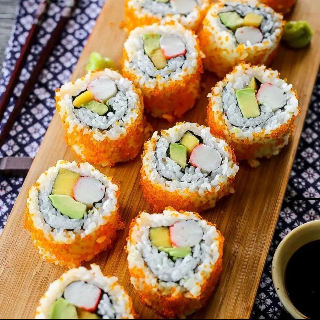 Rellenos de palta, queso crema y ebi barra, cubierta de ajonjolí mixto tostado.
