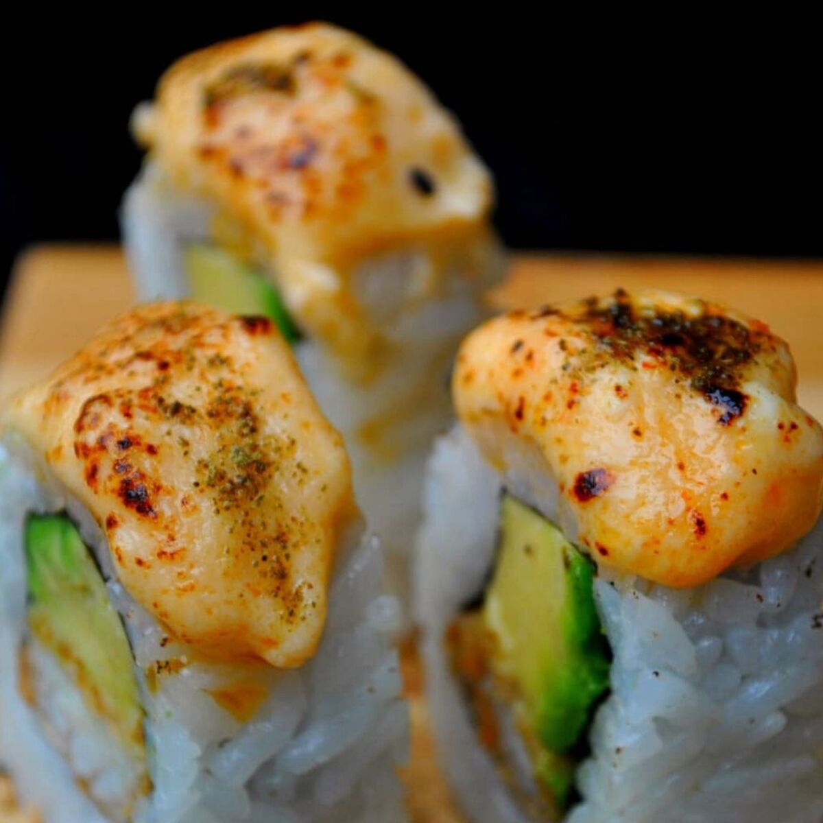 Rellenos de ebi furai con palta, cubierto de trucha salmonada con salsa de queso parmesano.