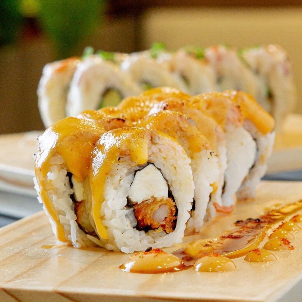 Rellenos de ebi furai con palta, cubierto de pescado con salsa acevichada.