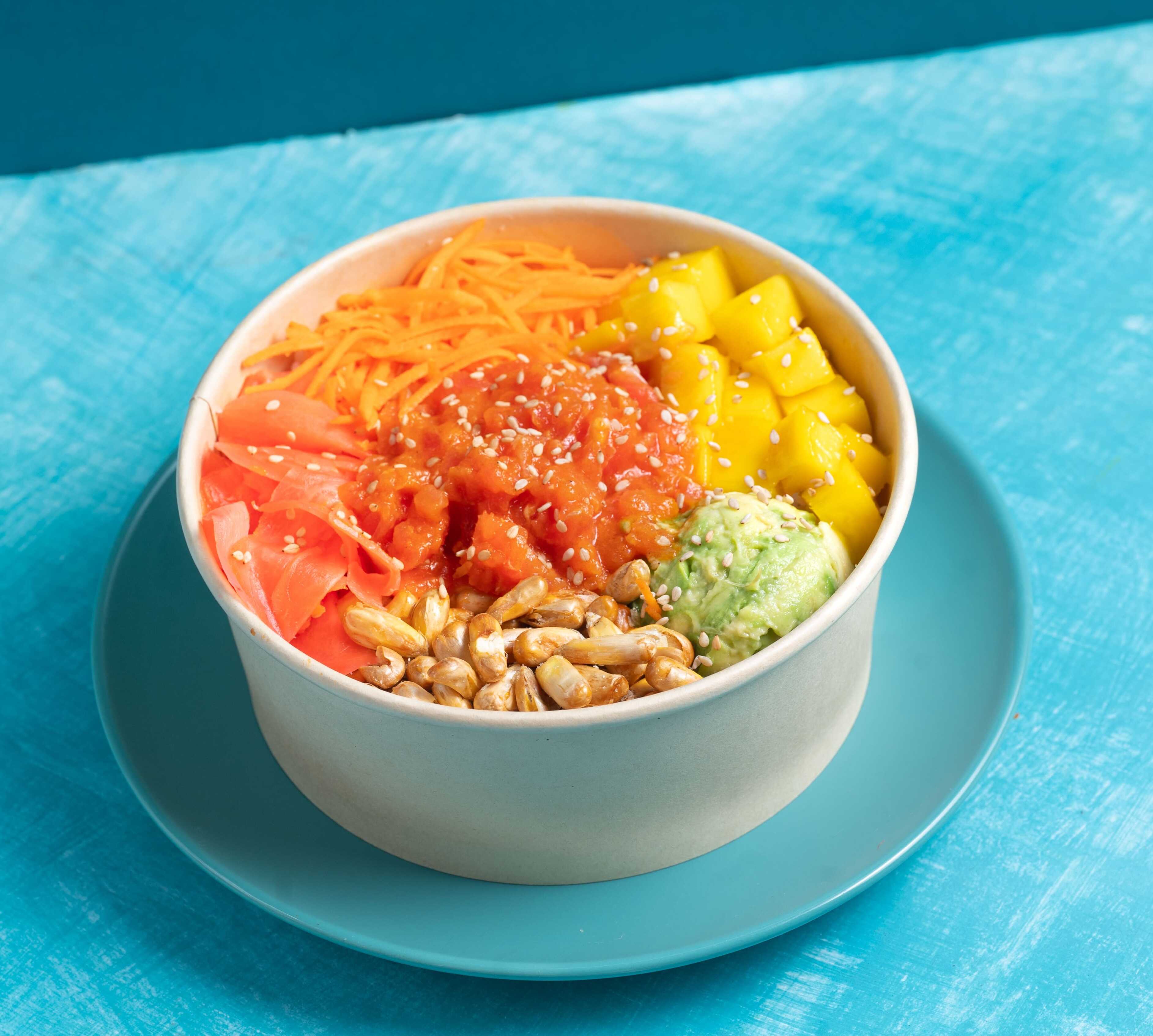 Nuestro Nuevo Poke con Spicy Tuna, Mango, Palta, Chulpi, Gari, Zanahoria y Ajonjoli blanco en base de Arroz Sushi y Greens (24oz)