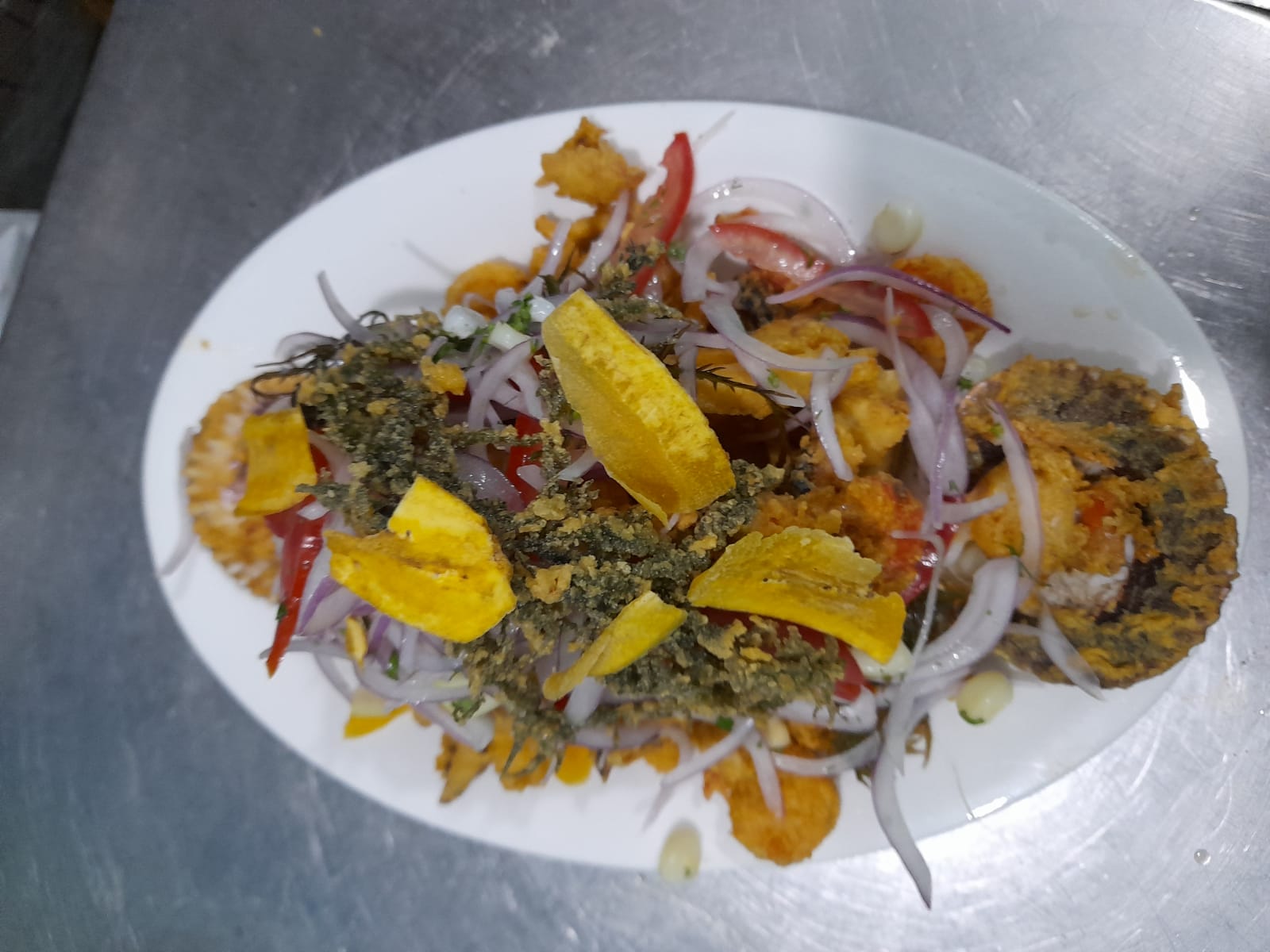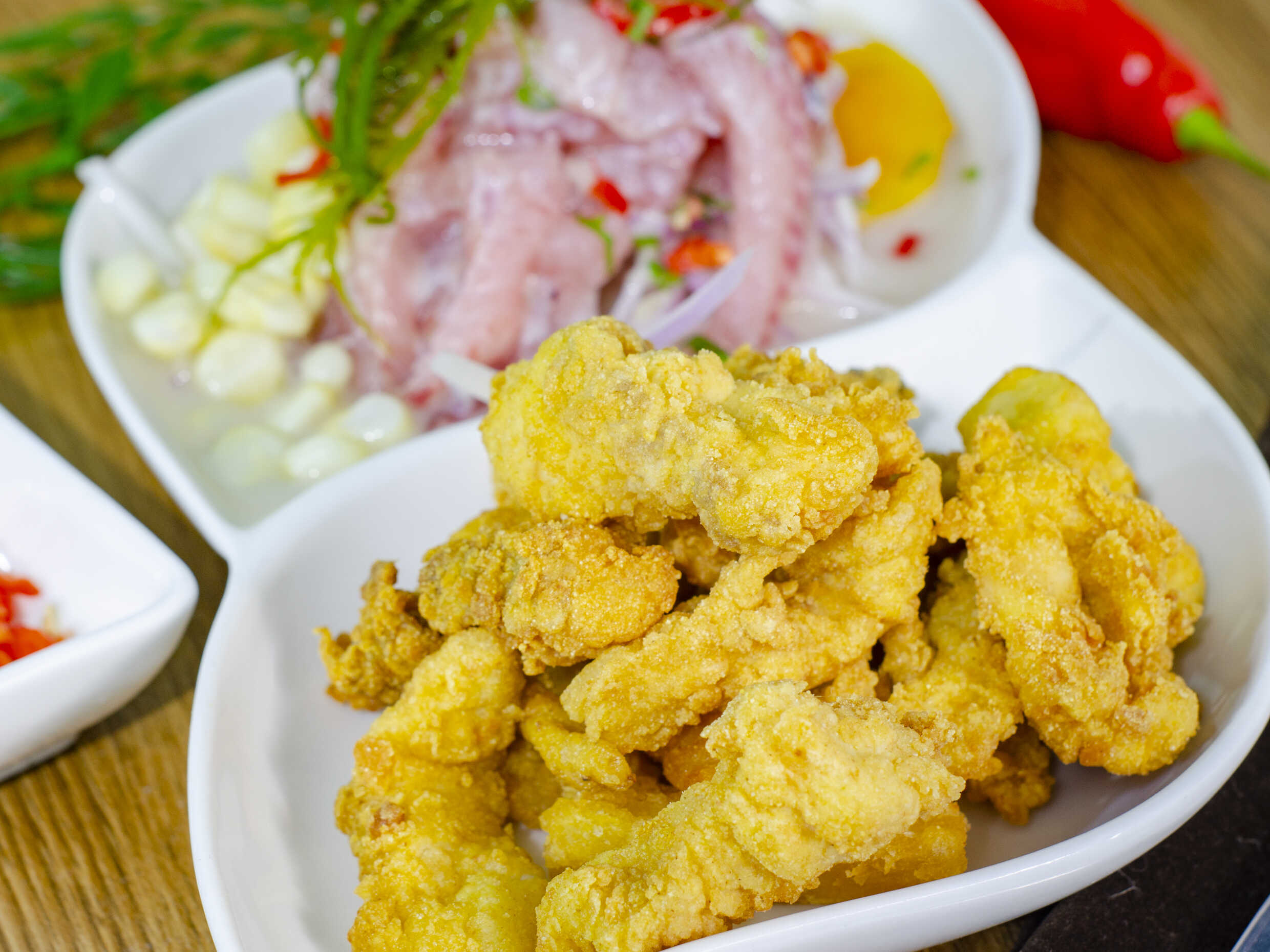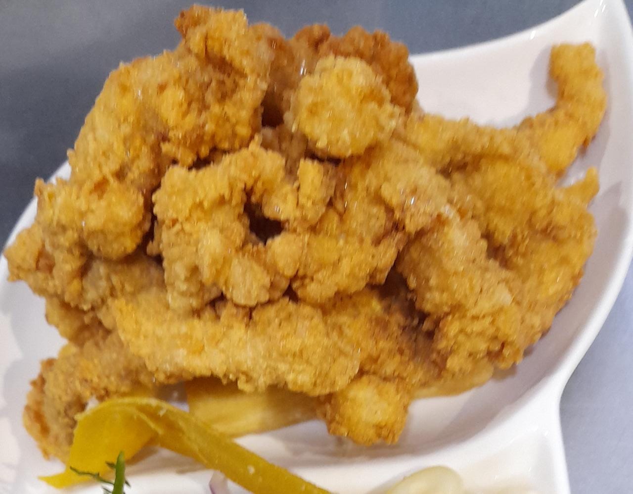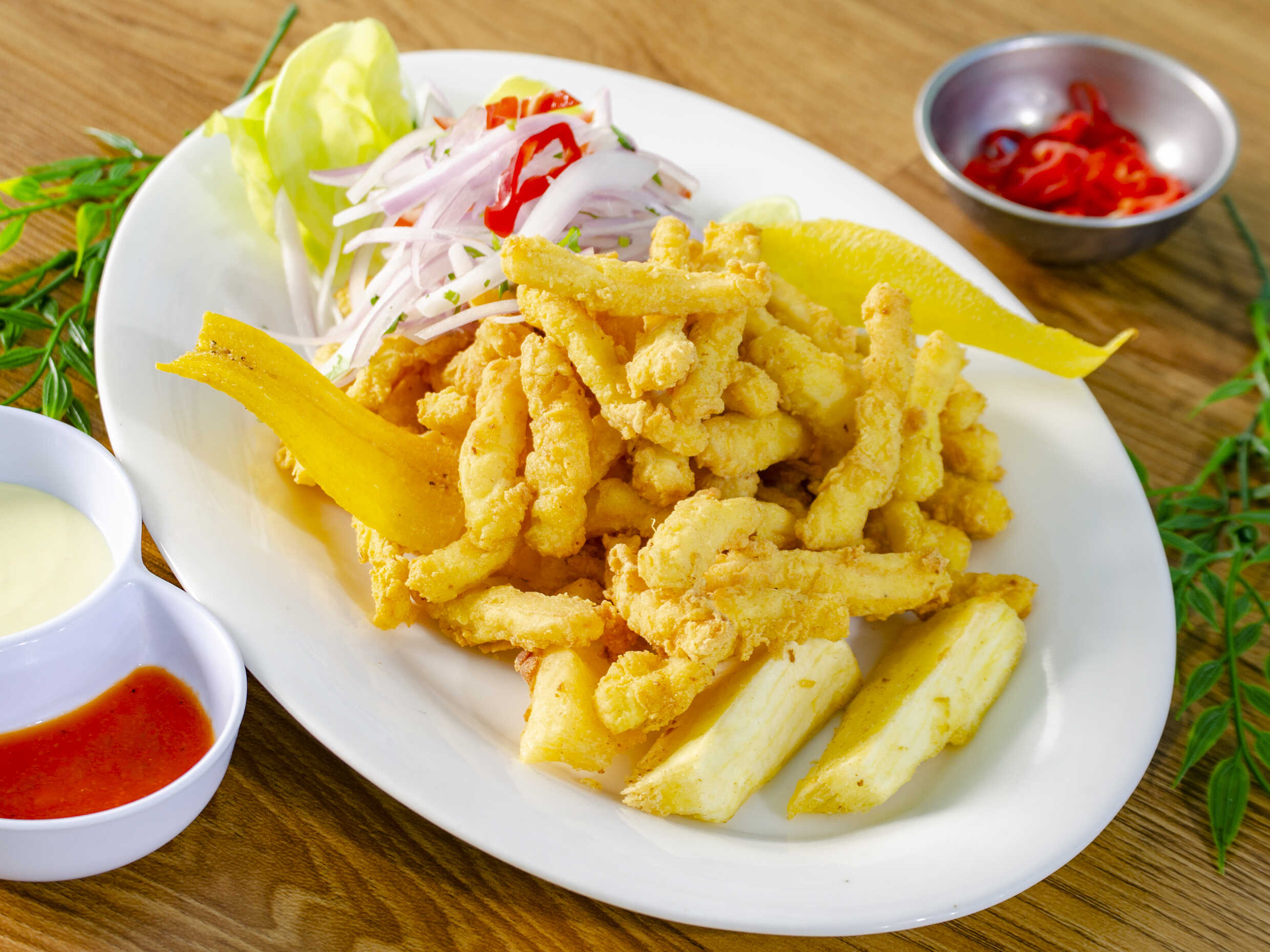 Trozos de pescado, mixtura de mariscos, yuyo frito, sarsa