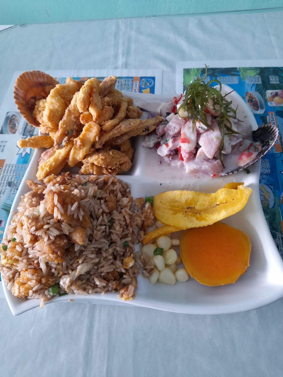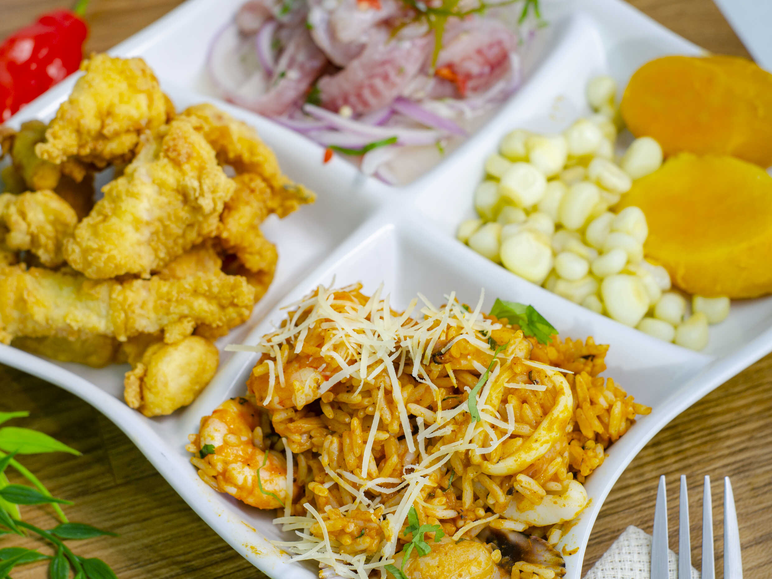 Ceviche de pescado, chicharrón de pescado y arroz con mariscos.