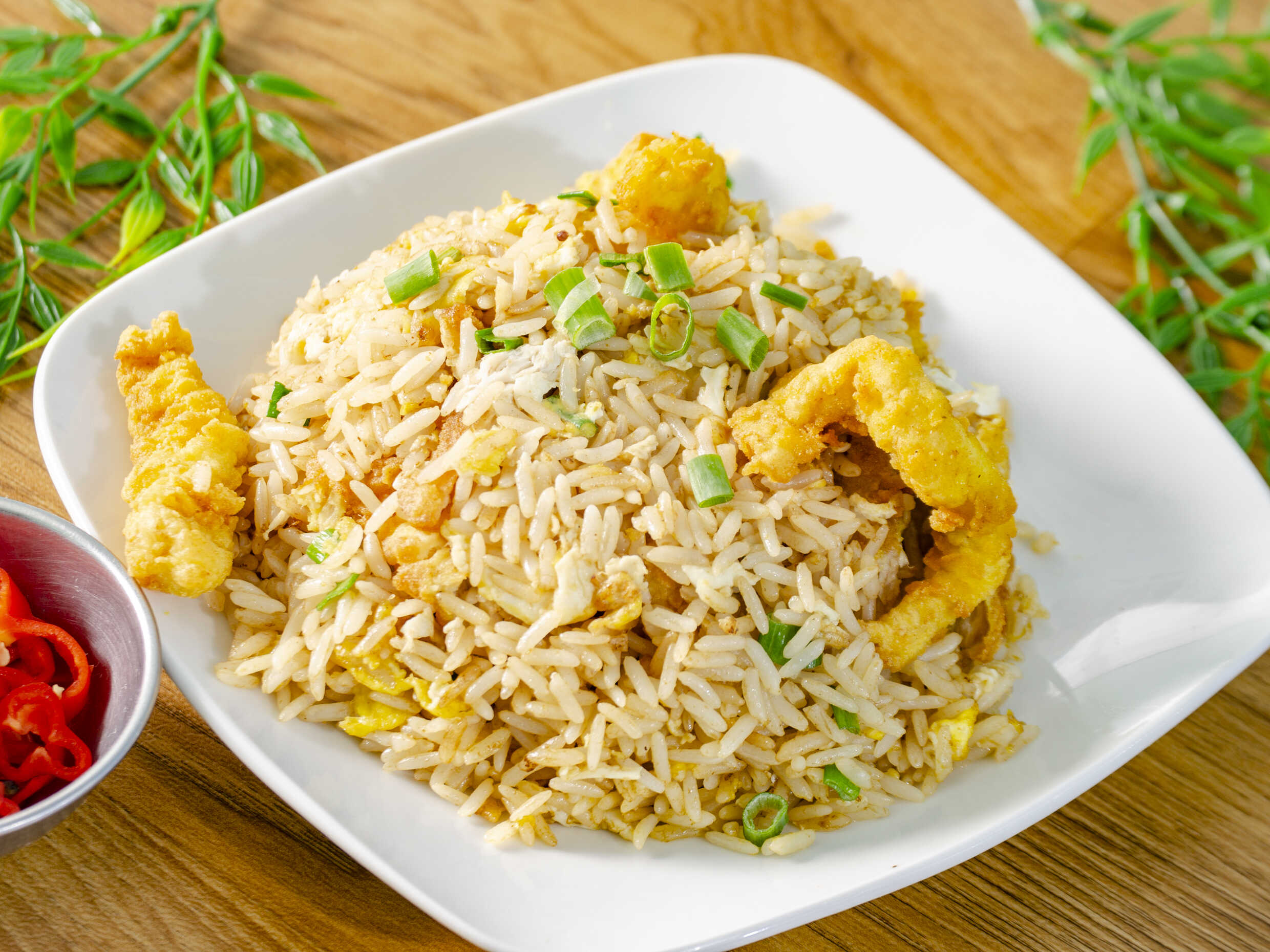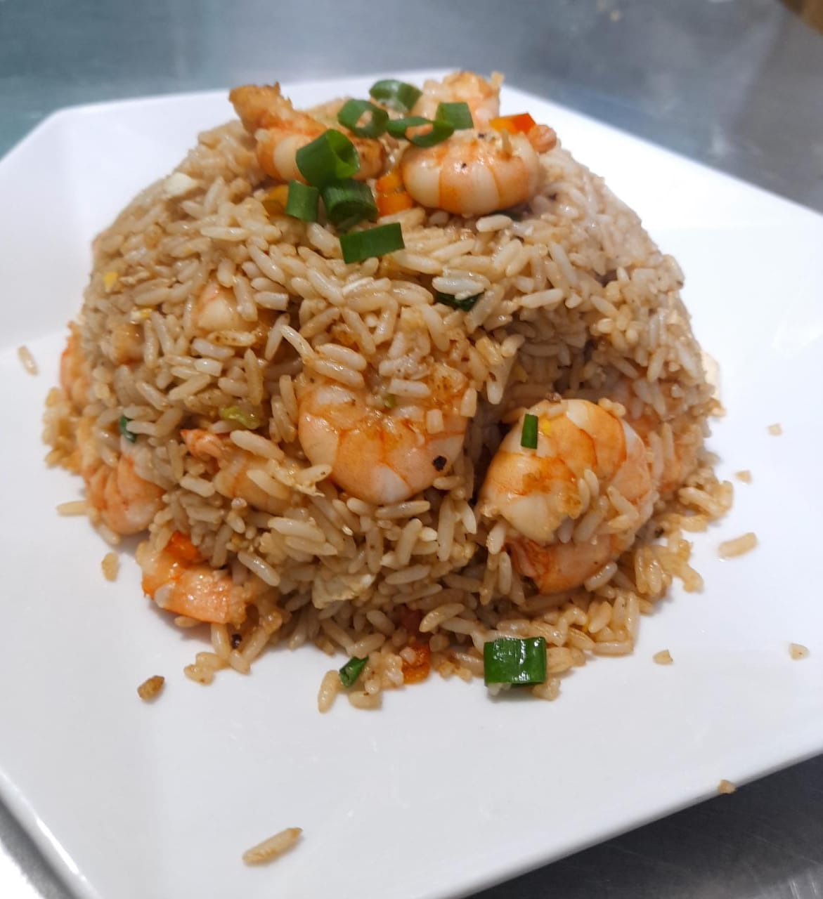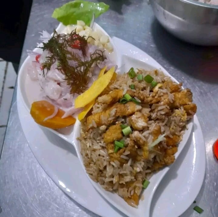 Ceviche de pescado, chicharrón de pescado y chaufa de pescado.