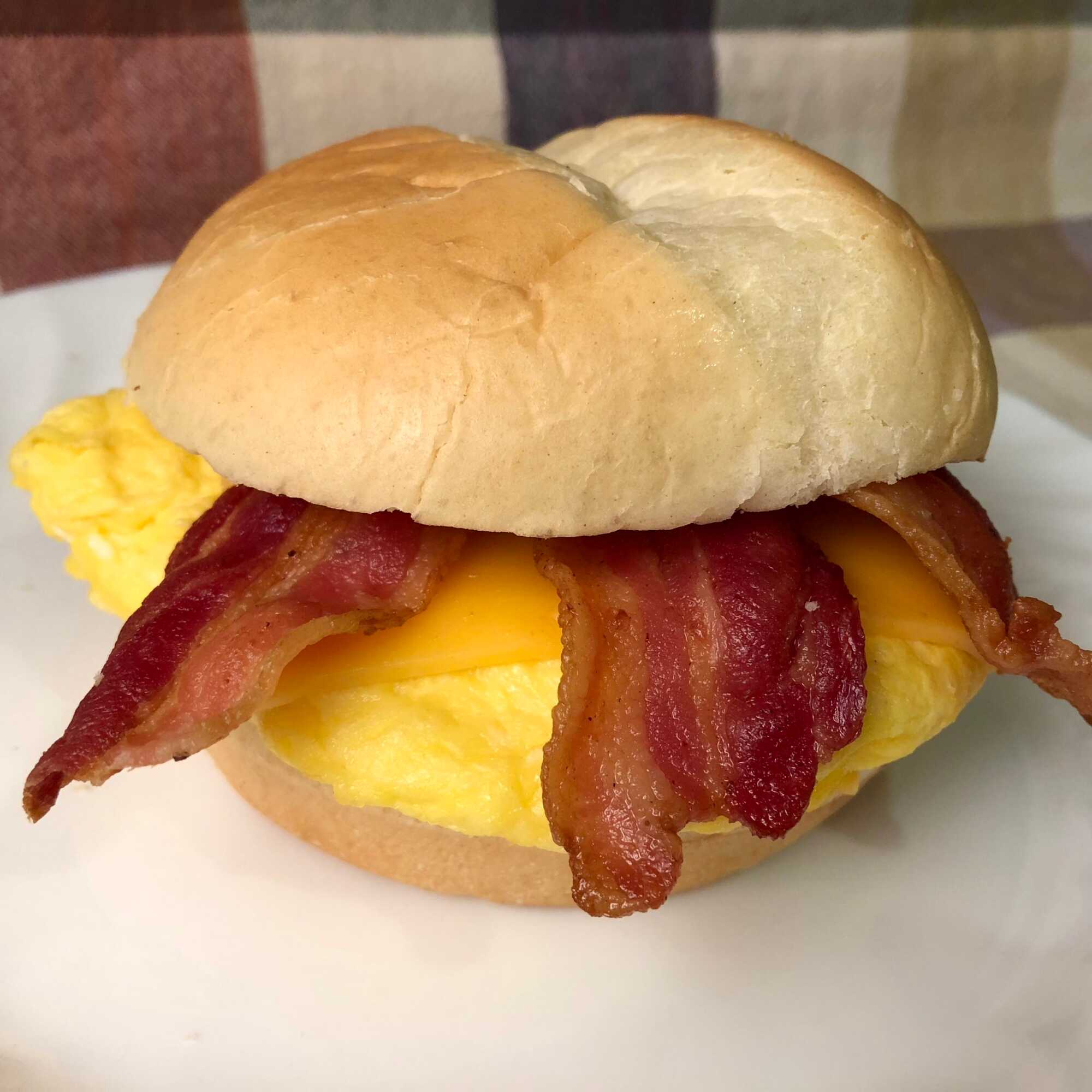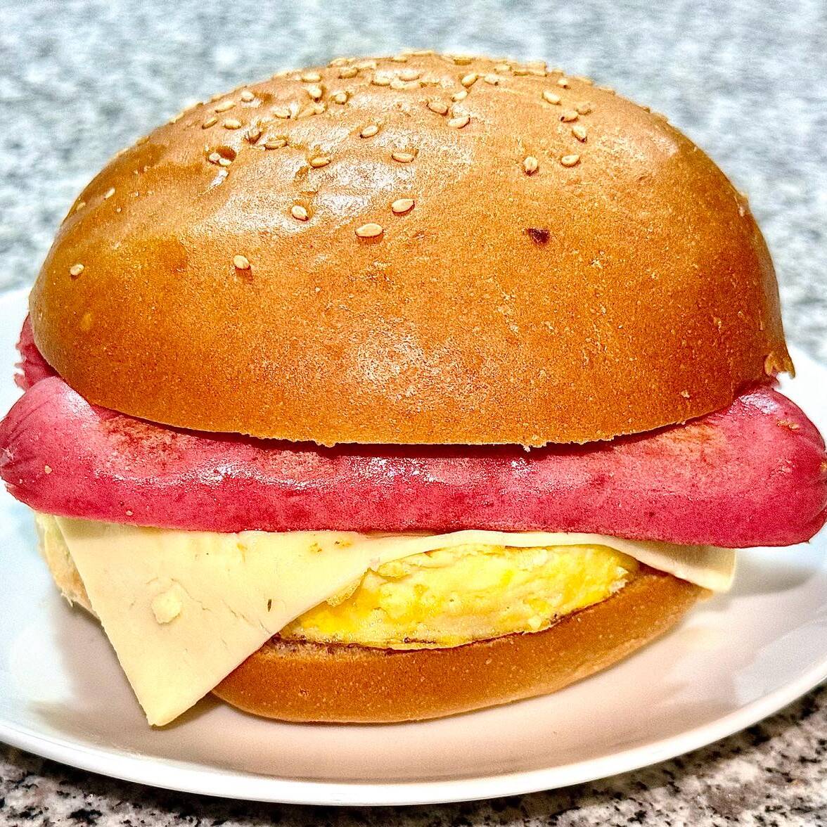 Sándwich caliente con tocino, huevo frito y queso mozarella en pan de hamburguesa.