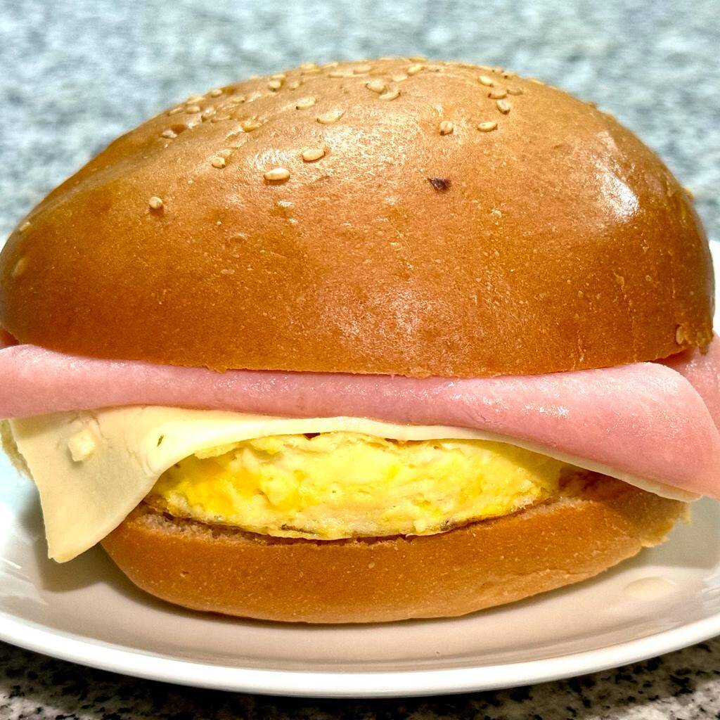 Sándwich caliente con jamón inglés, huevo frito y queso mozzarella en pan hamburguesa.