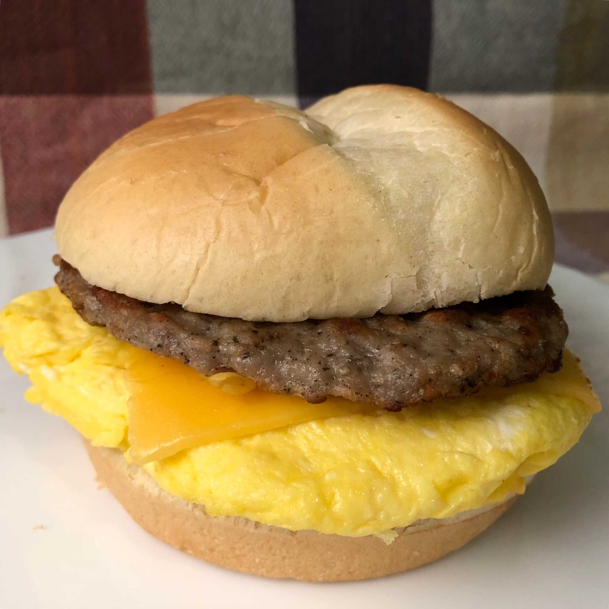 Chorizo, huevo frito y queso en pan hamburguesa.