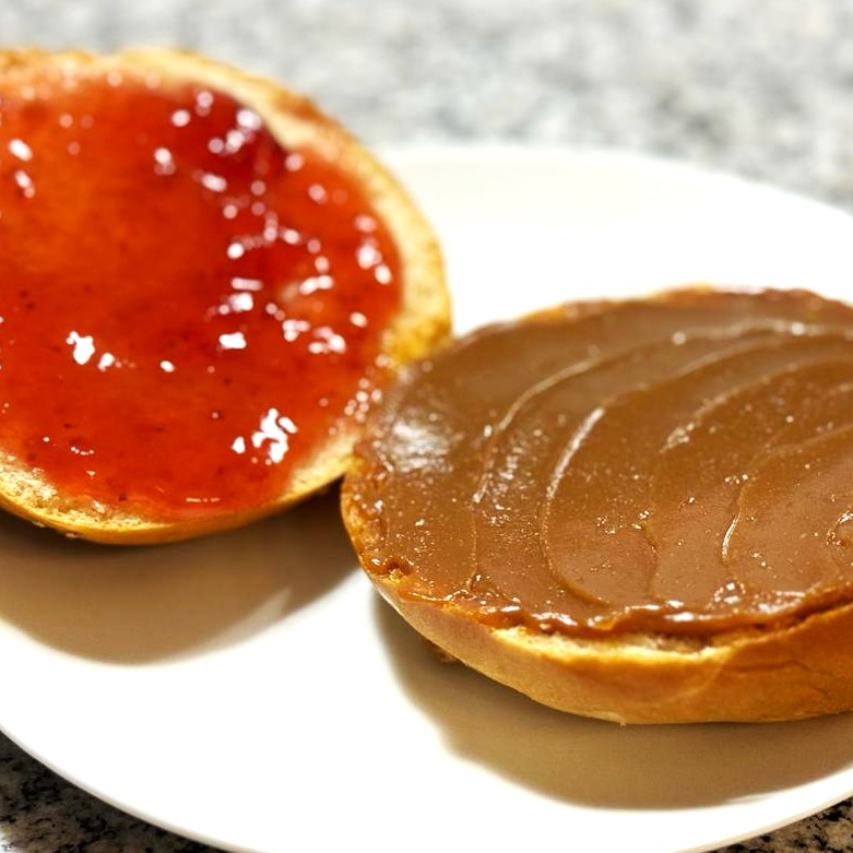 Mantequilla de maní y mermelada untada en pan de hamburguesa.