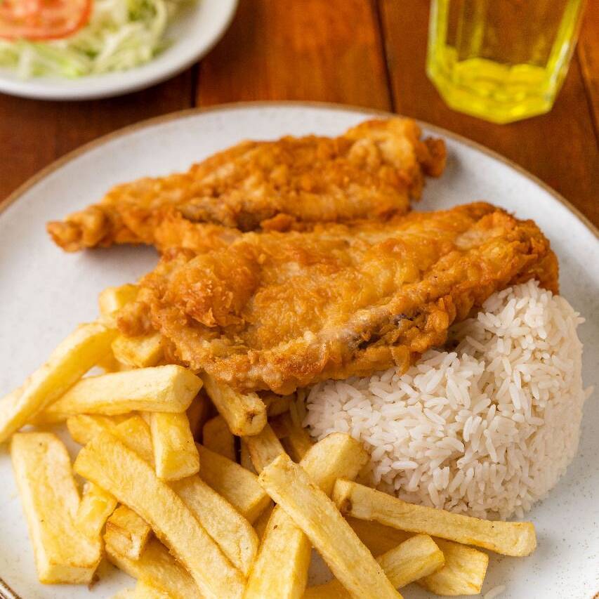 Milanesa de pollo acompañada de arroz y crocantes papas fritas.