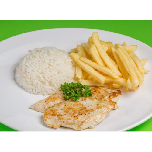 Pollo a la plancha con papas, arroz y ensalada del día.