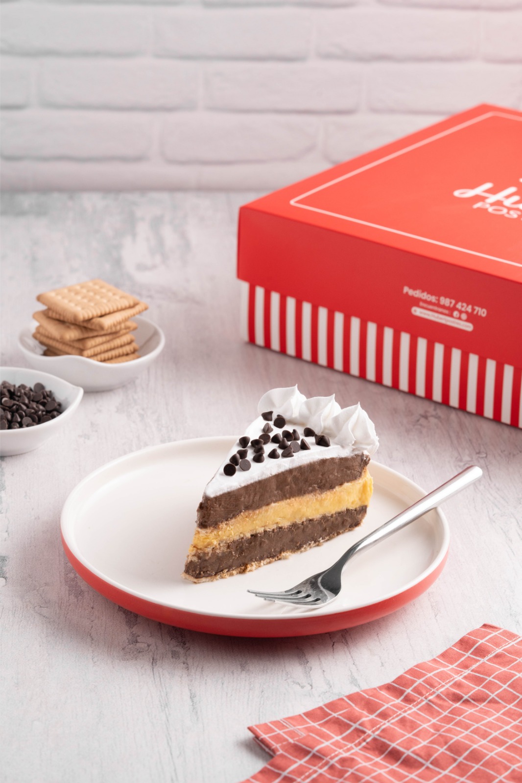 Postre a base de galleta tentación y crema marmoleada de queso, cubierta con chispas de chocolate.