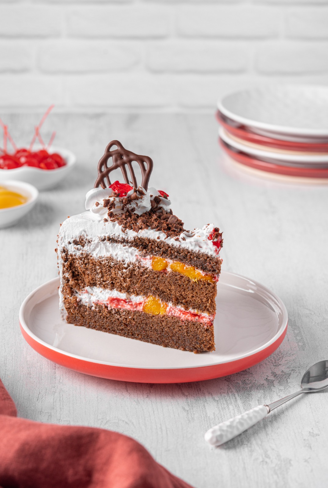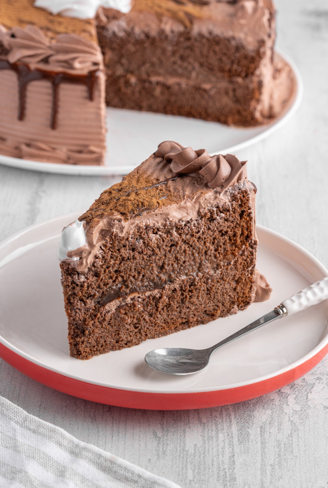 Bizcocho de chocolate con almíbar, rellena de mermelada con trozos de durazno y recubierta con chocolate, bañado en chantilly.