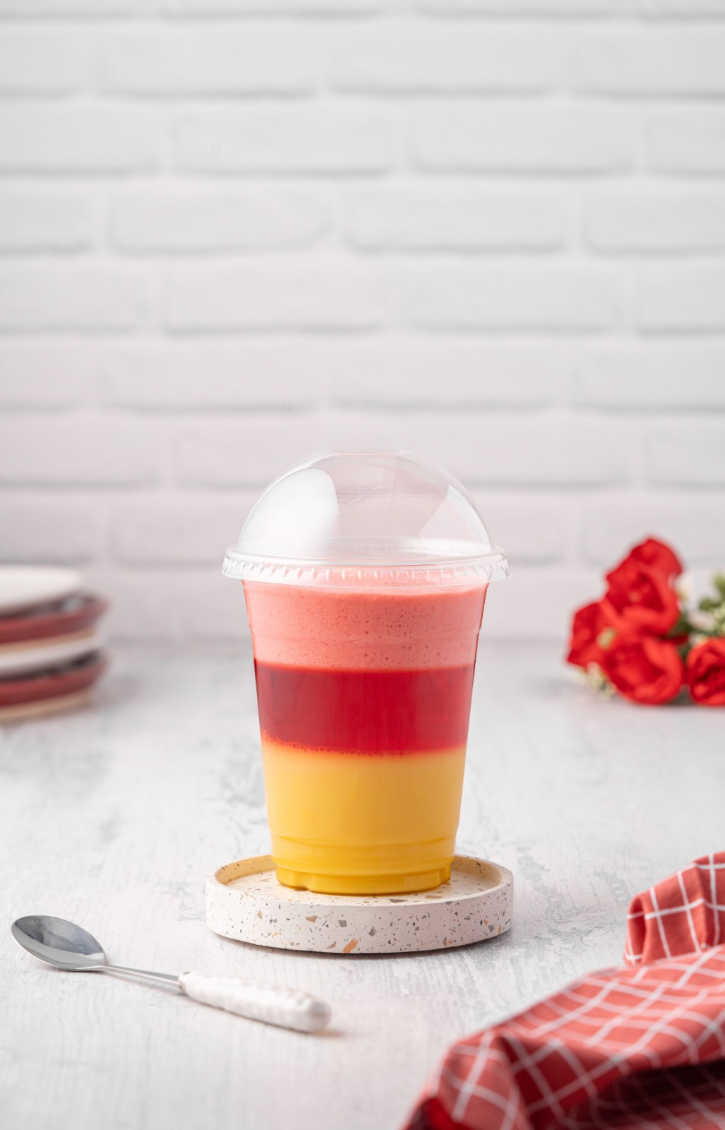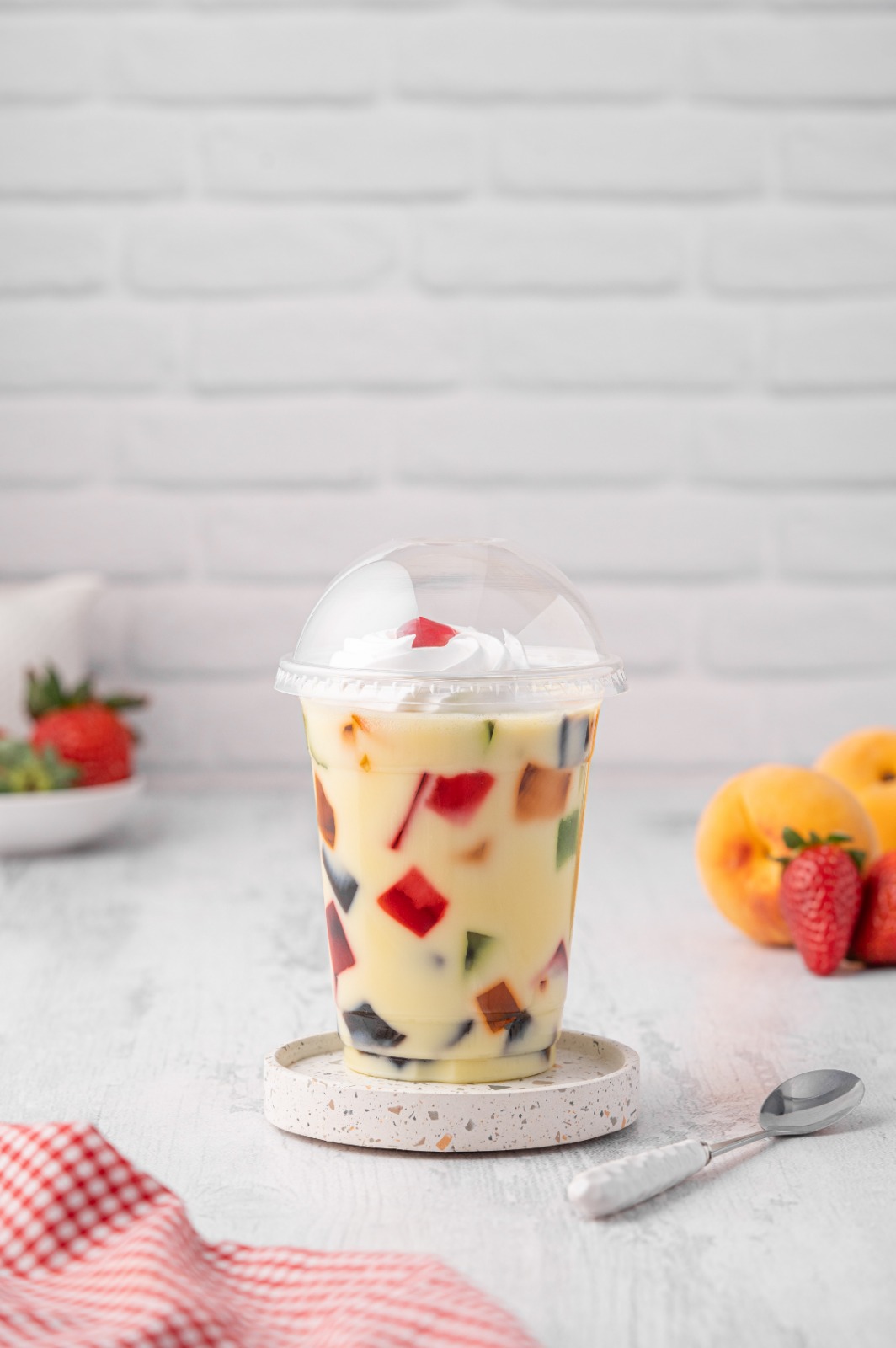 Postre en vaso con diferentes sabores de gelatinas; teniendo como crema principal batido de leche con gelatina.