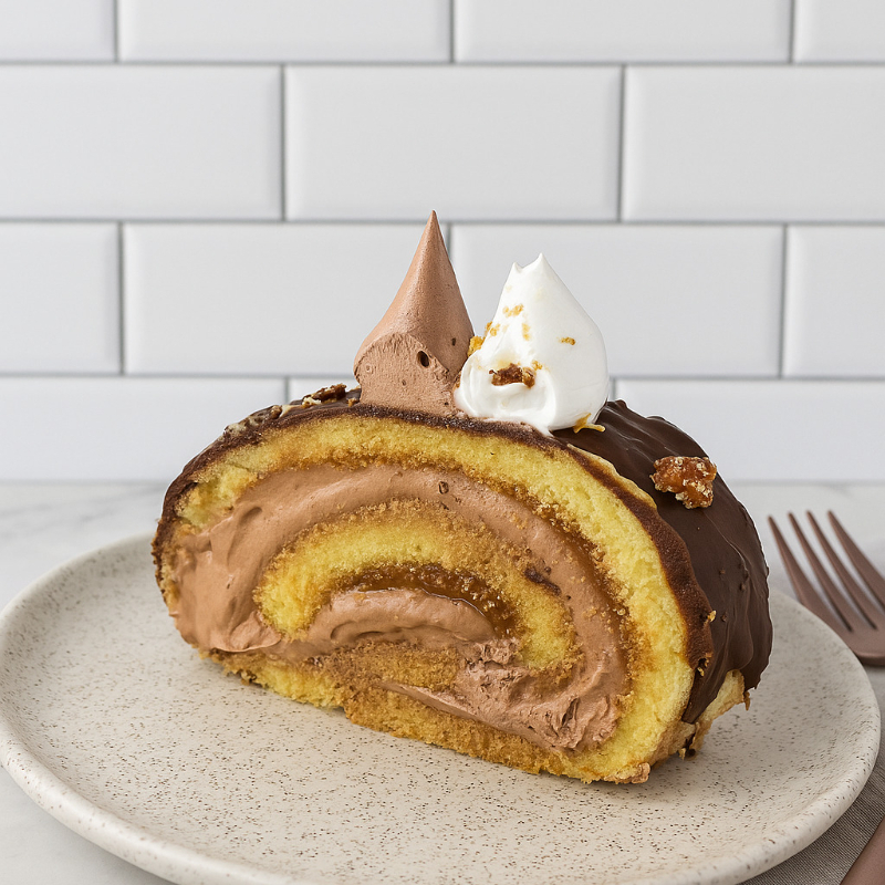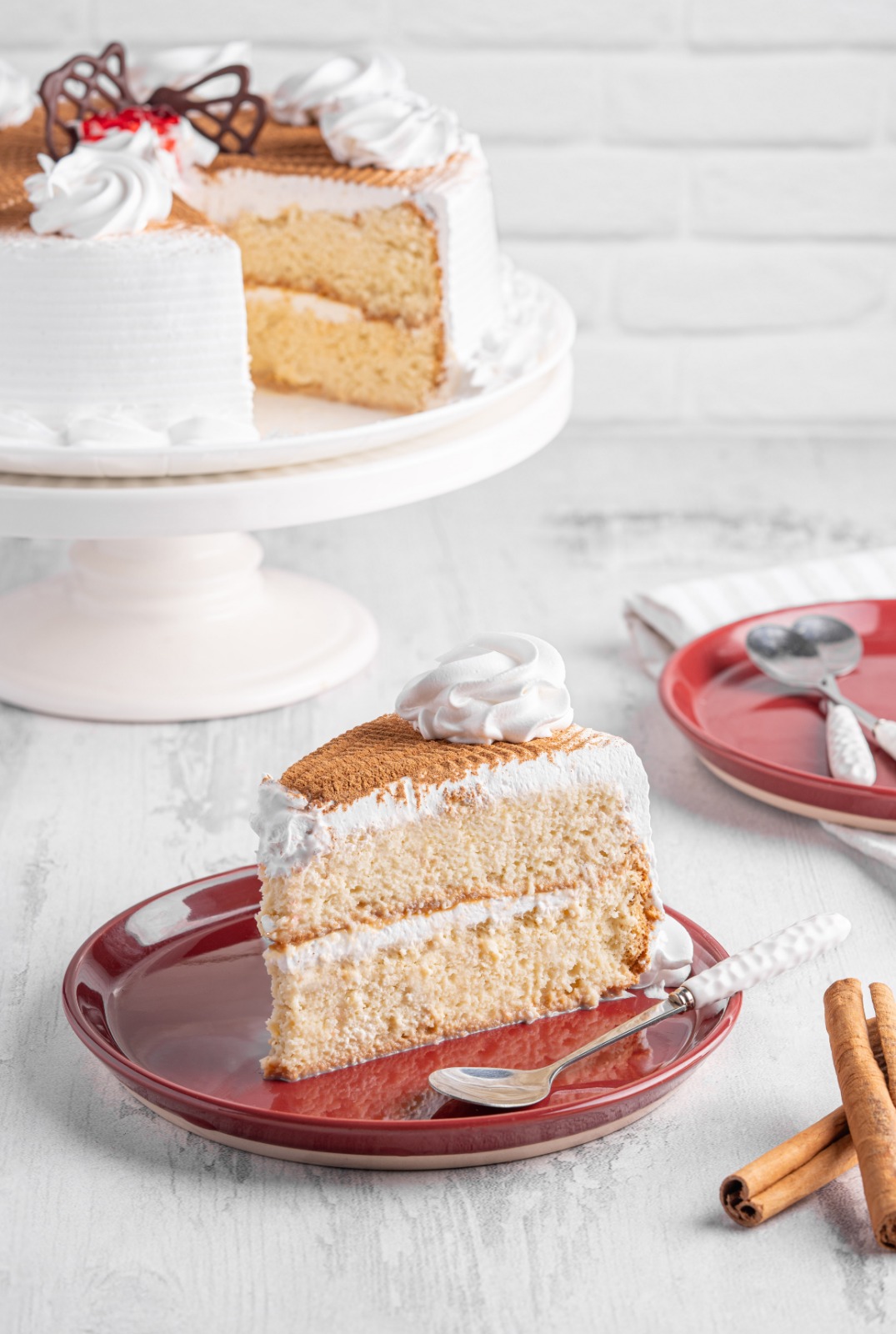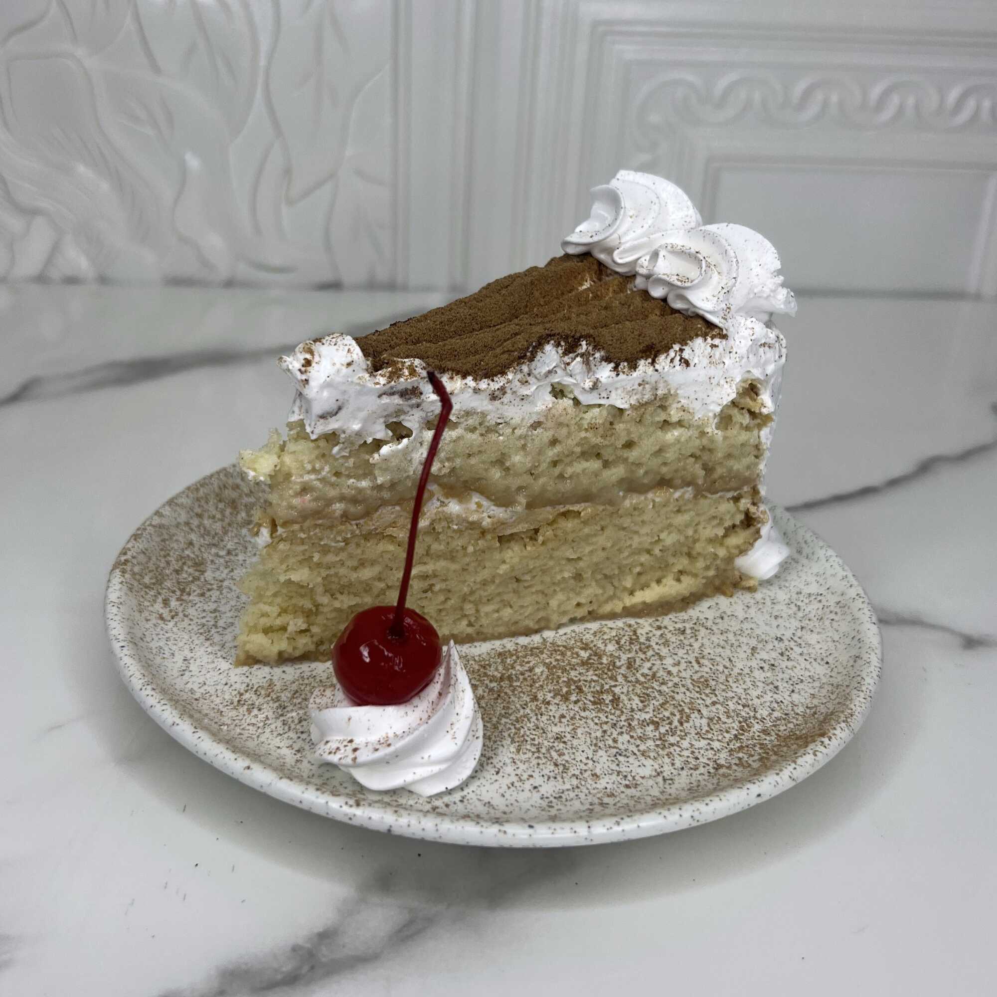 Torta de leche entera, crema de leche, leche condensada, bañada en chantilly, porción personal.