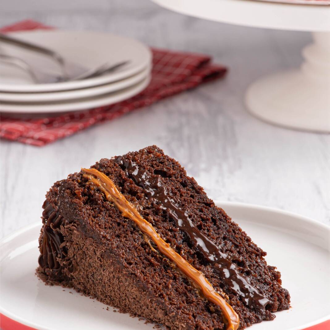 Deliciosa torta de chocolate con relleno de manjarblanco, cubierto con fudge.