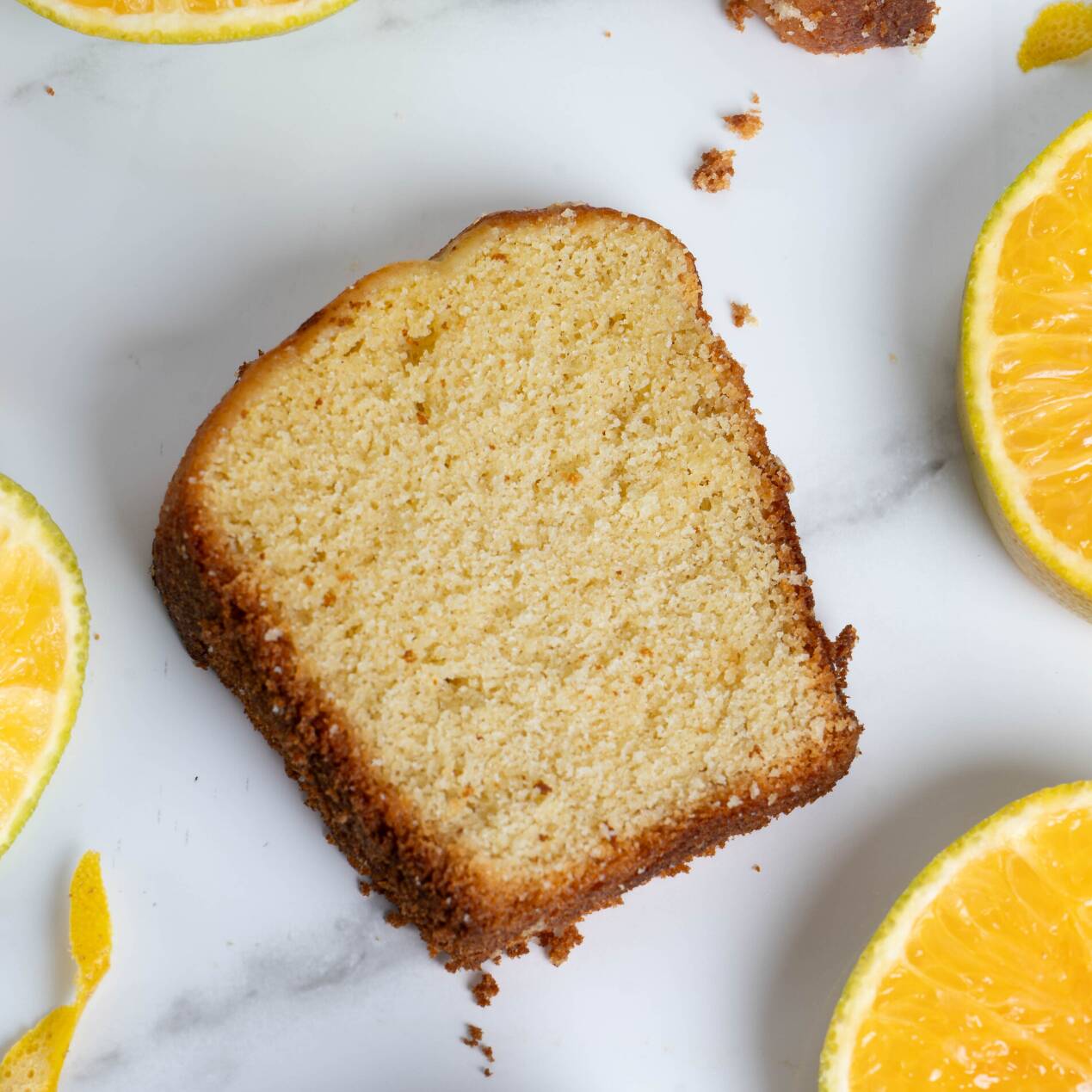 Deliciosa porción de un keke de naranja súper esponjoso.