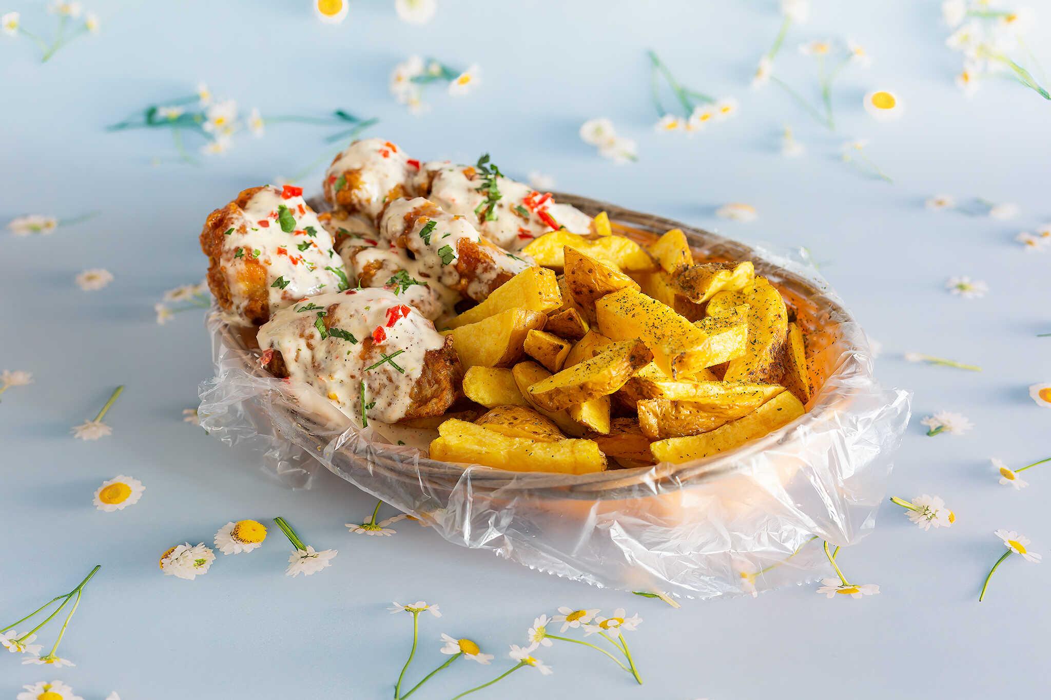 Alitas en deliciosa salsa bbq acompañado de papas fritas.