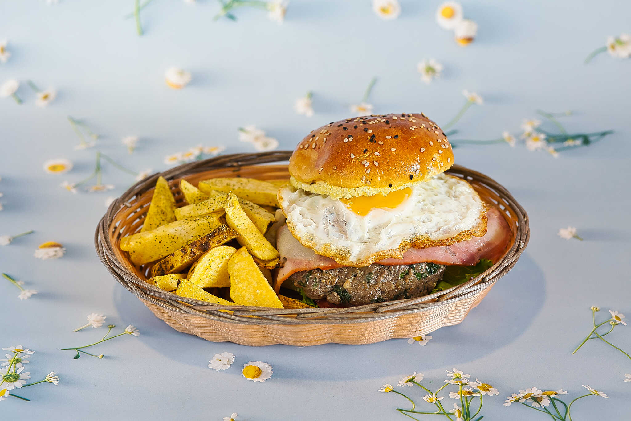 Hamburguesa artesanal, tocino, huevo, lechuga y tomate acompañado con papas fritas.