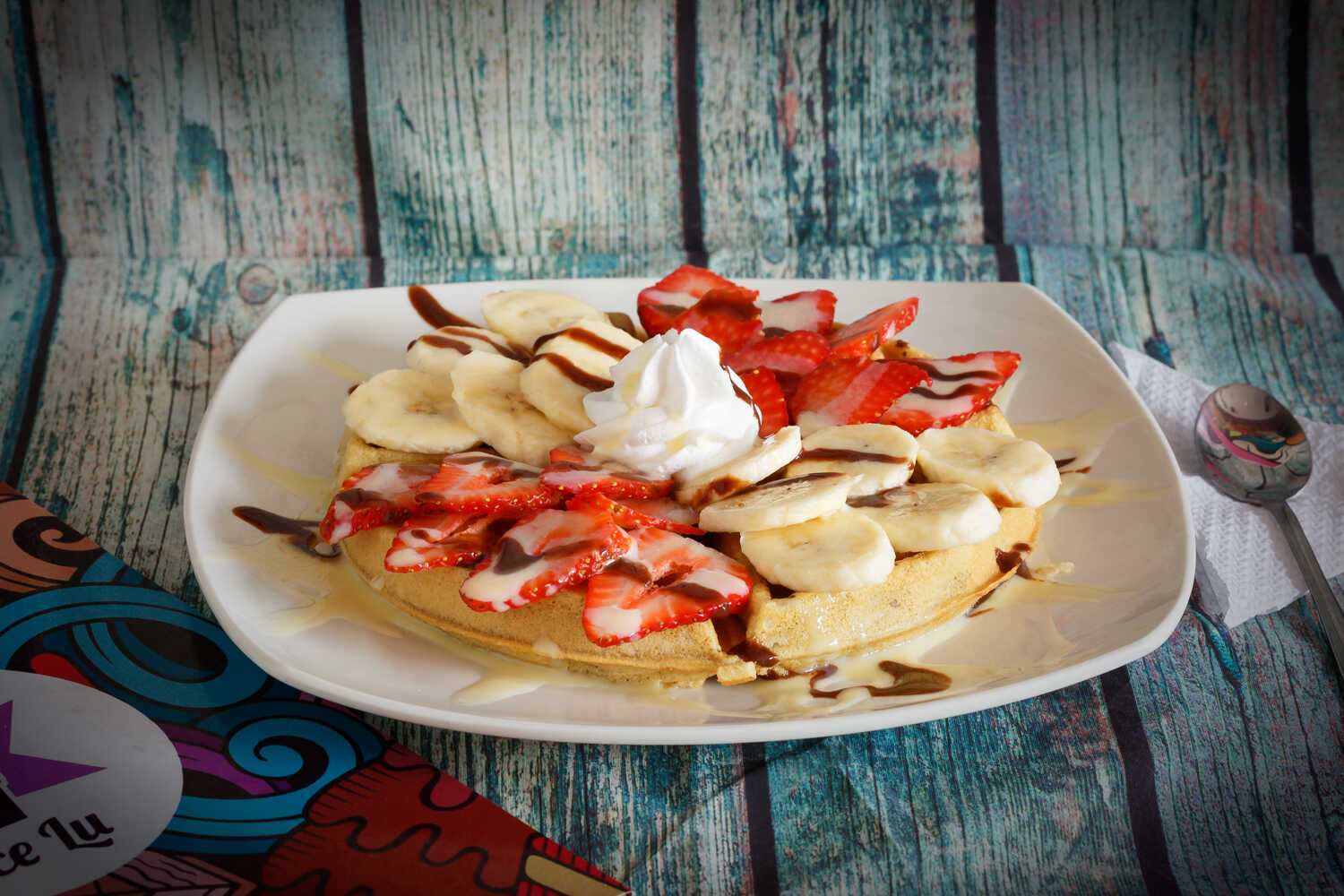 Esponjoso waffle cubierto de frutas y bañado con fudge de chocolate. Puede escoger dos frutas.