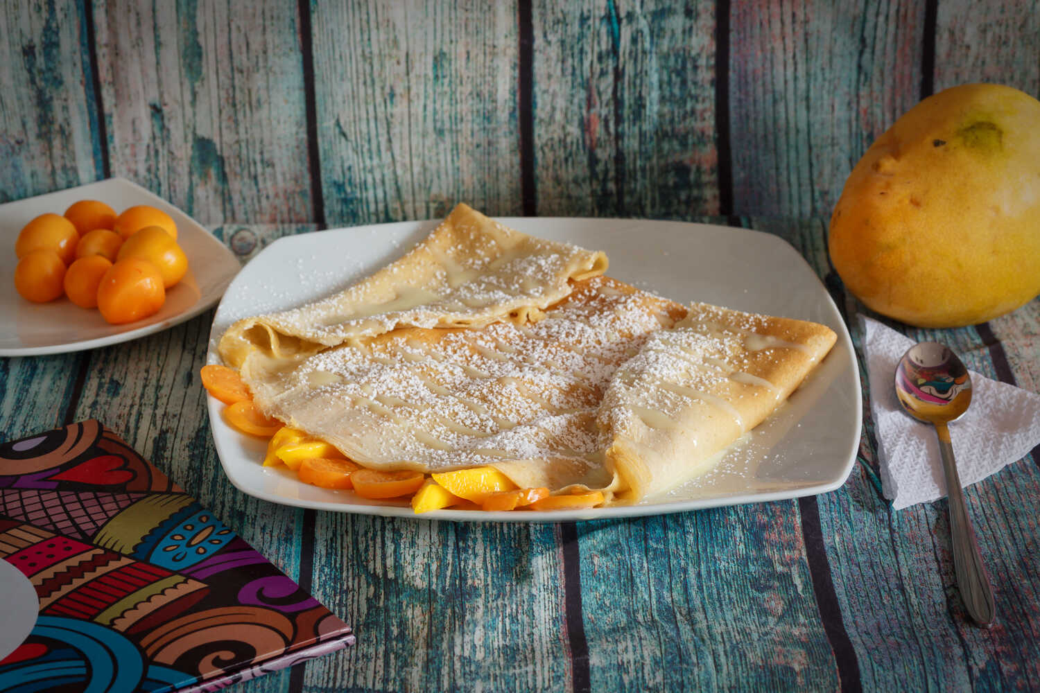 Esponjoso creppe relleno de frutas y bañado en leche condensada. puede escoger dos frutas.