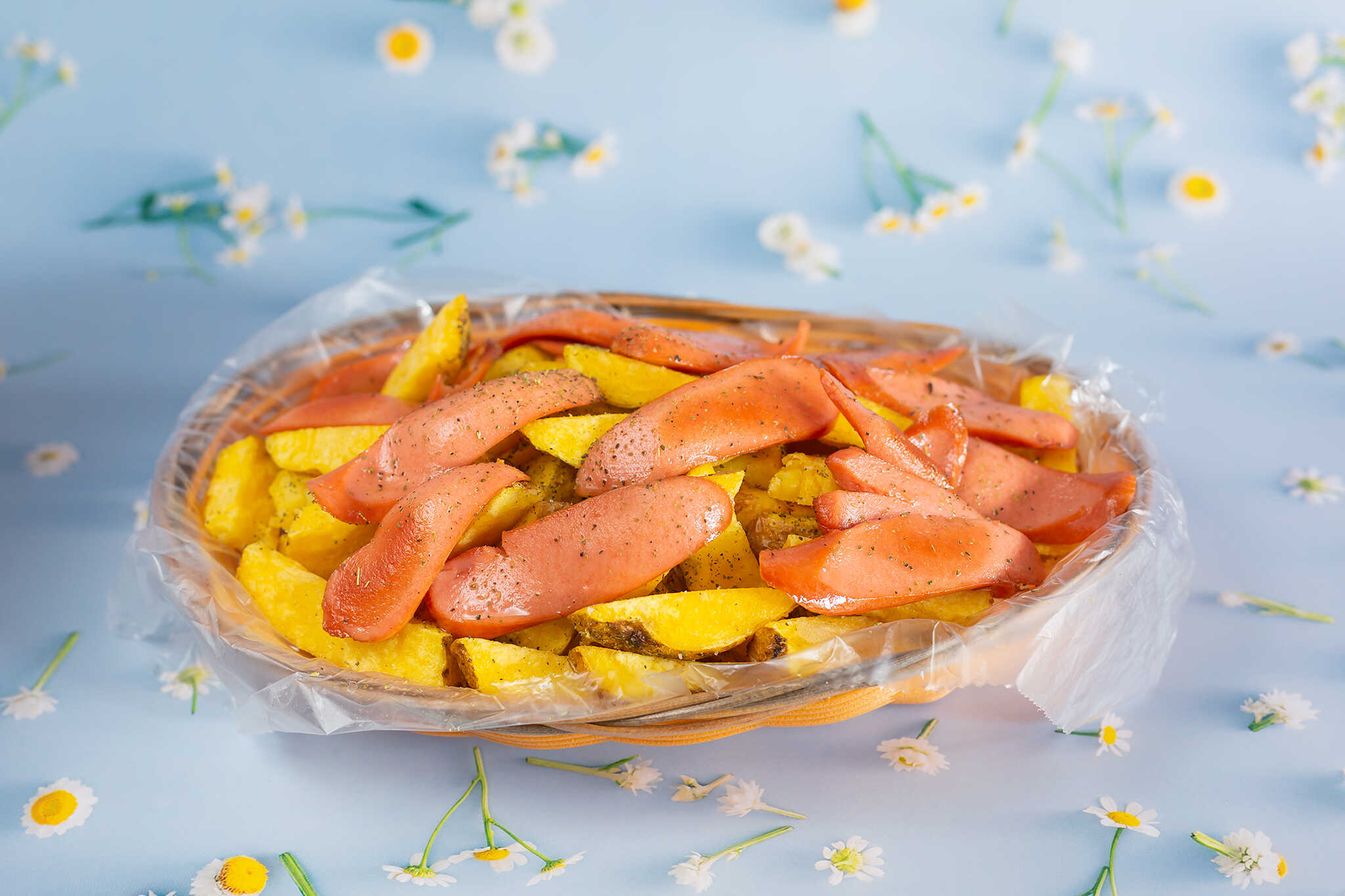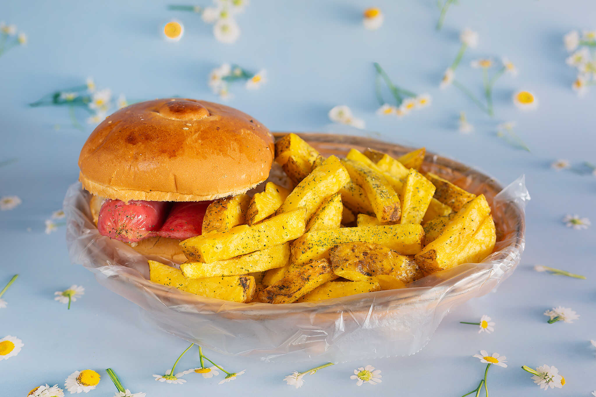 Delicioso chorizo de cerdo en pan hamburguesa acompañadas de una porción de papas fritas nativas.