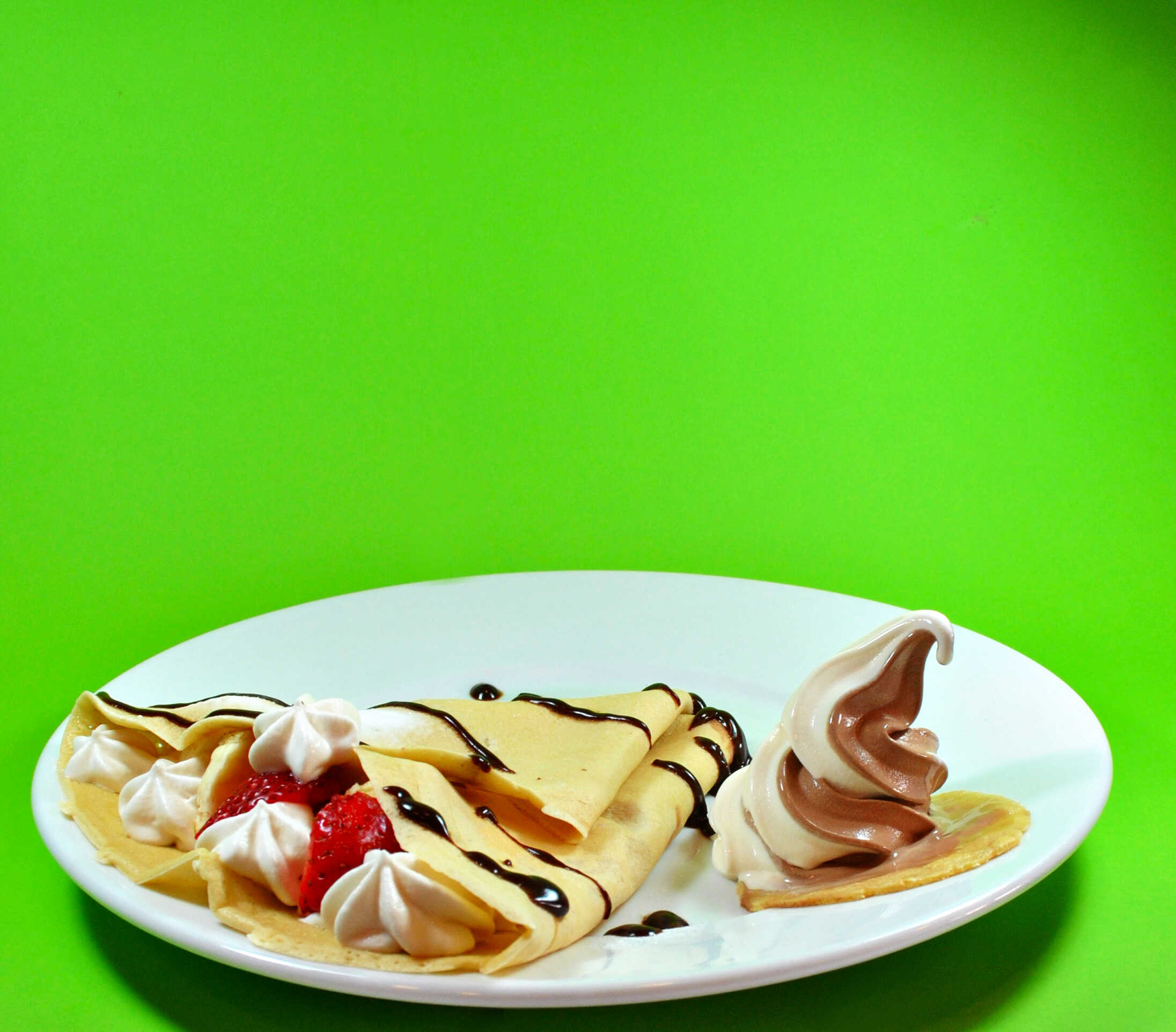 Esponjoso creppe relleno de frutas y bañado en dulce de leche, manjar blanco. Puede escoger dos frutas.