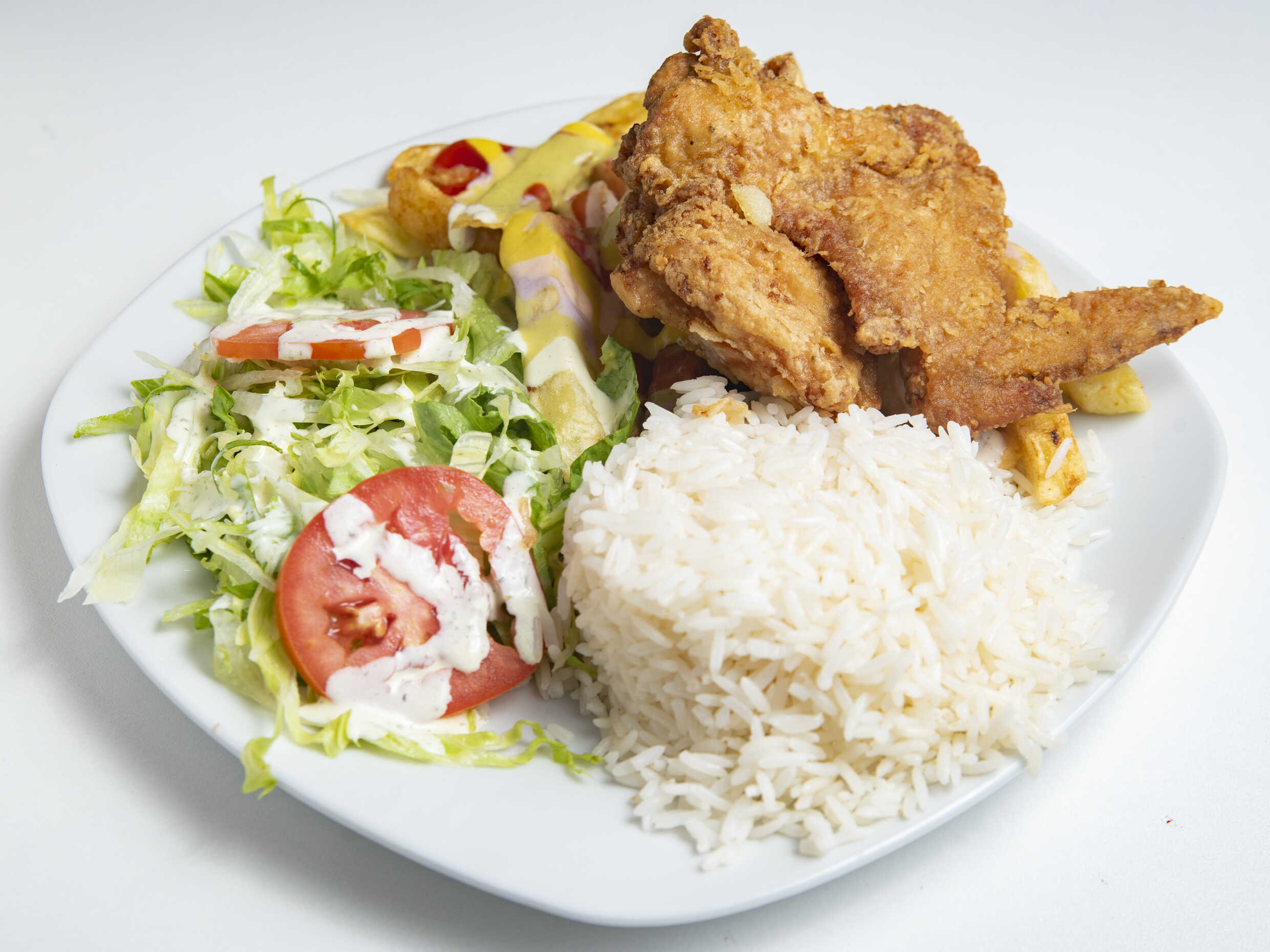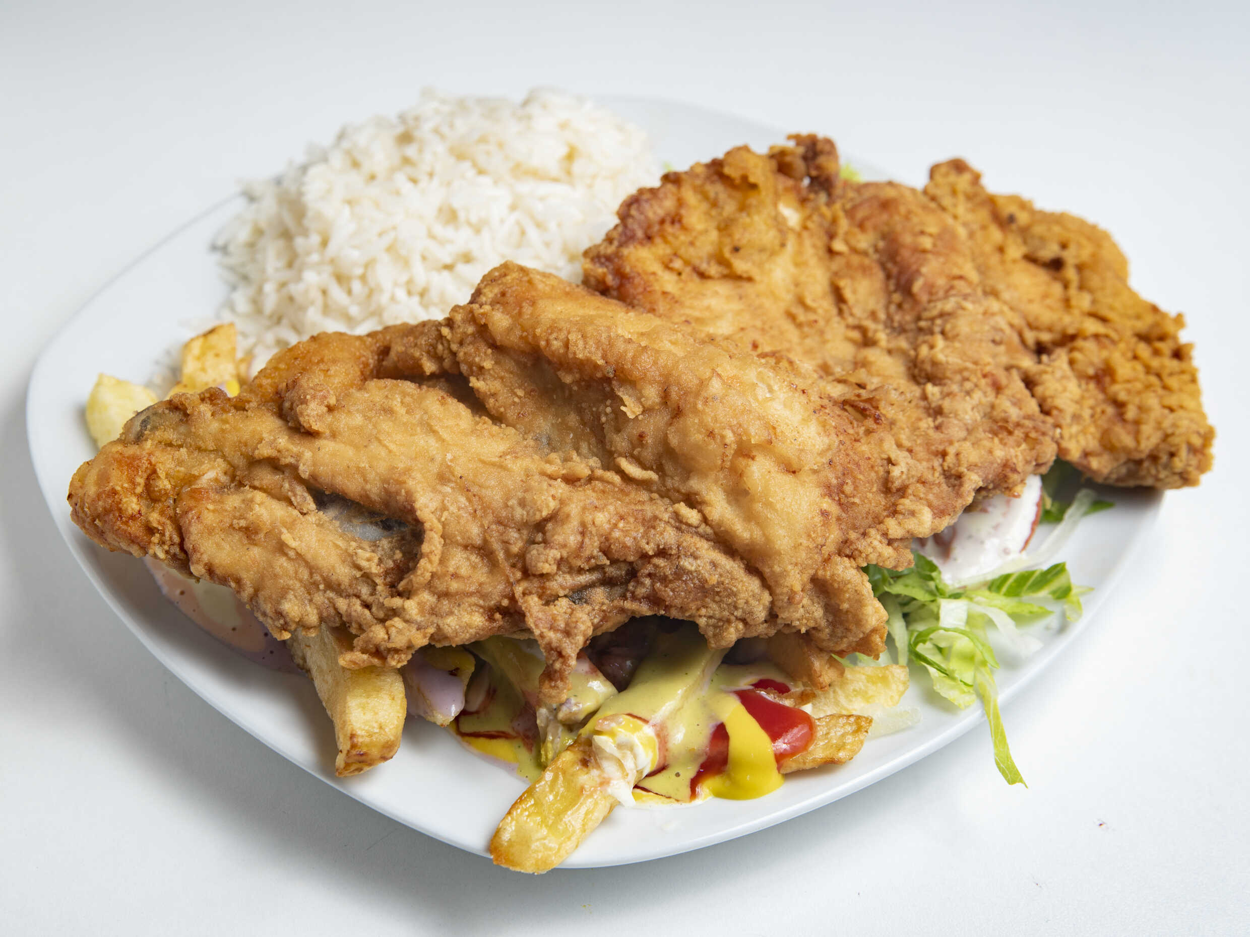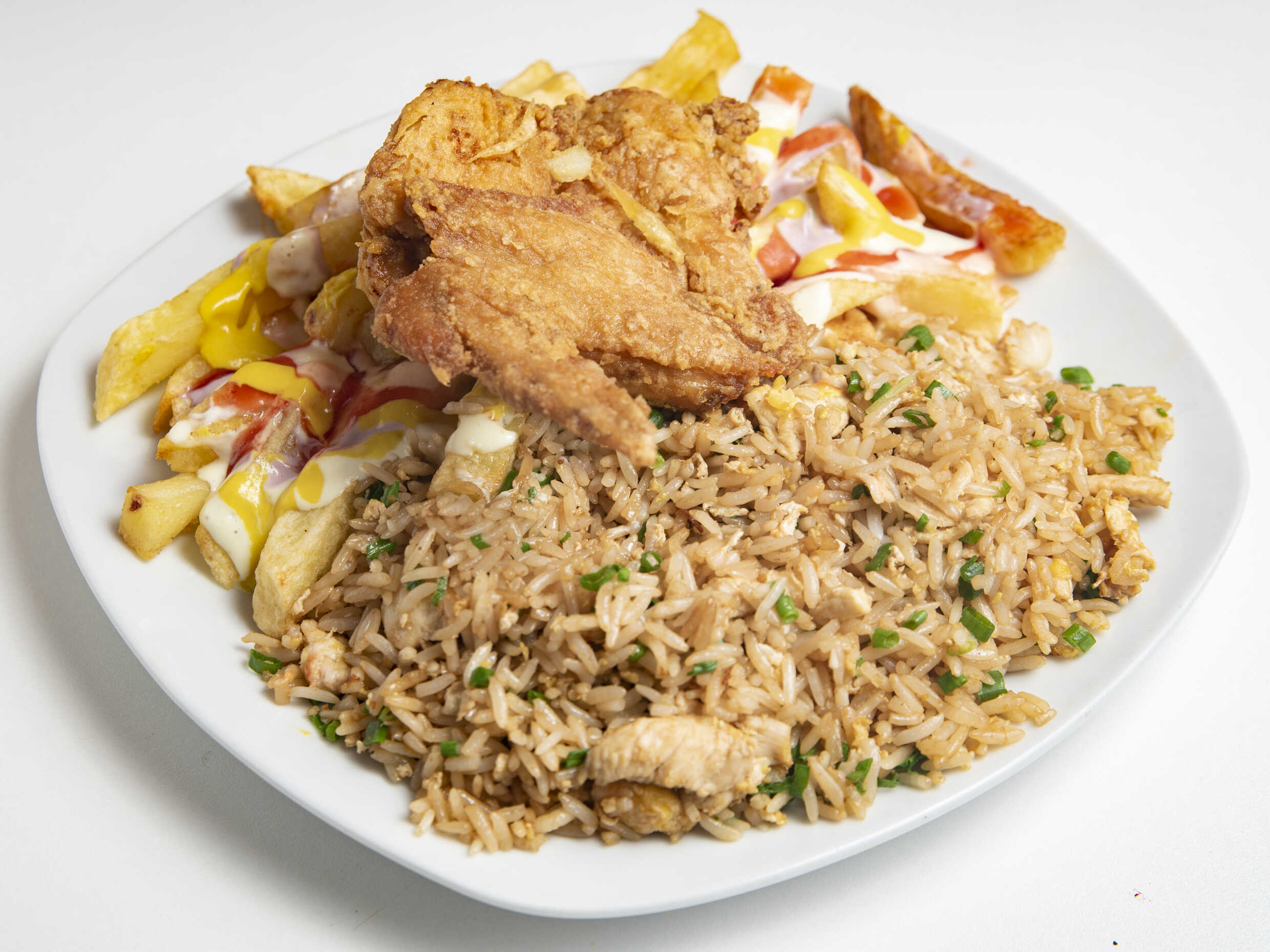 Acompañado de papas fritas, arroz chaufa y ensalada de lechuga.