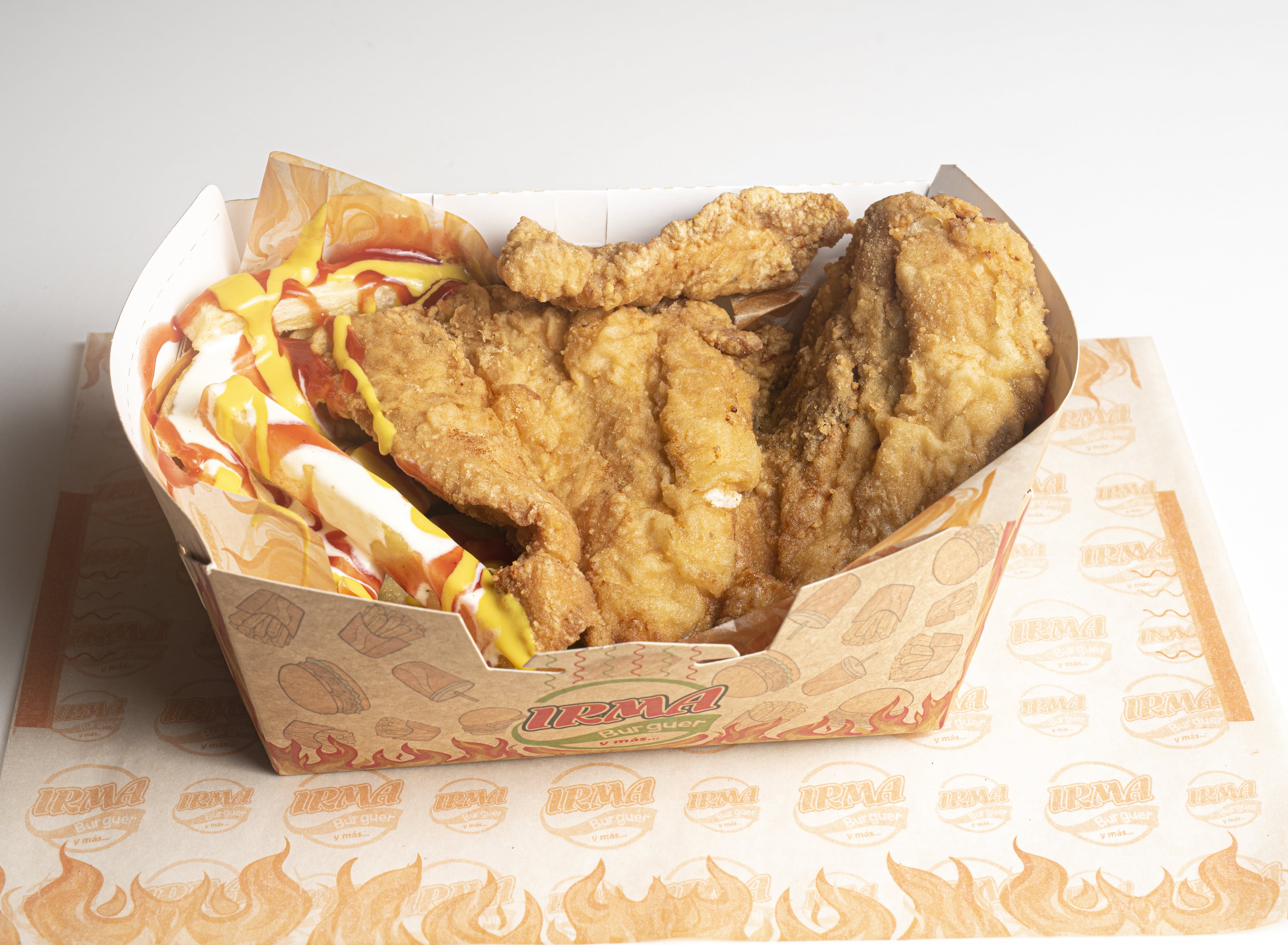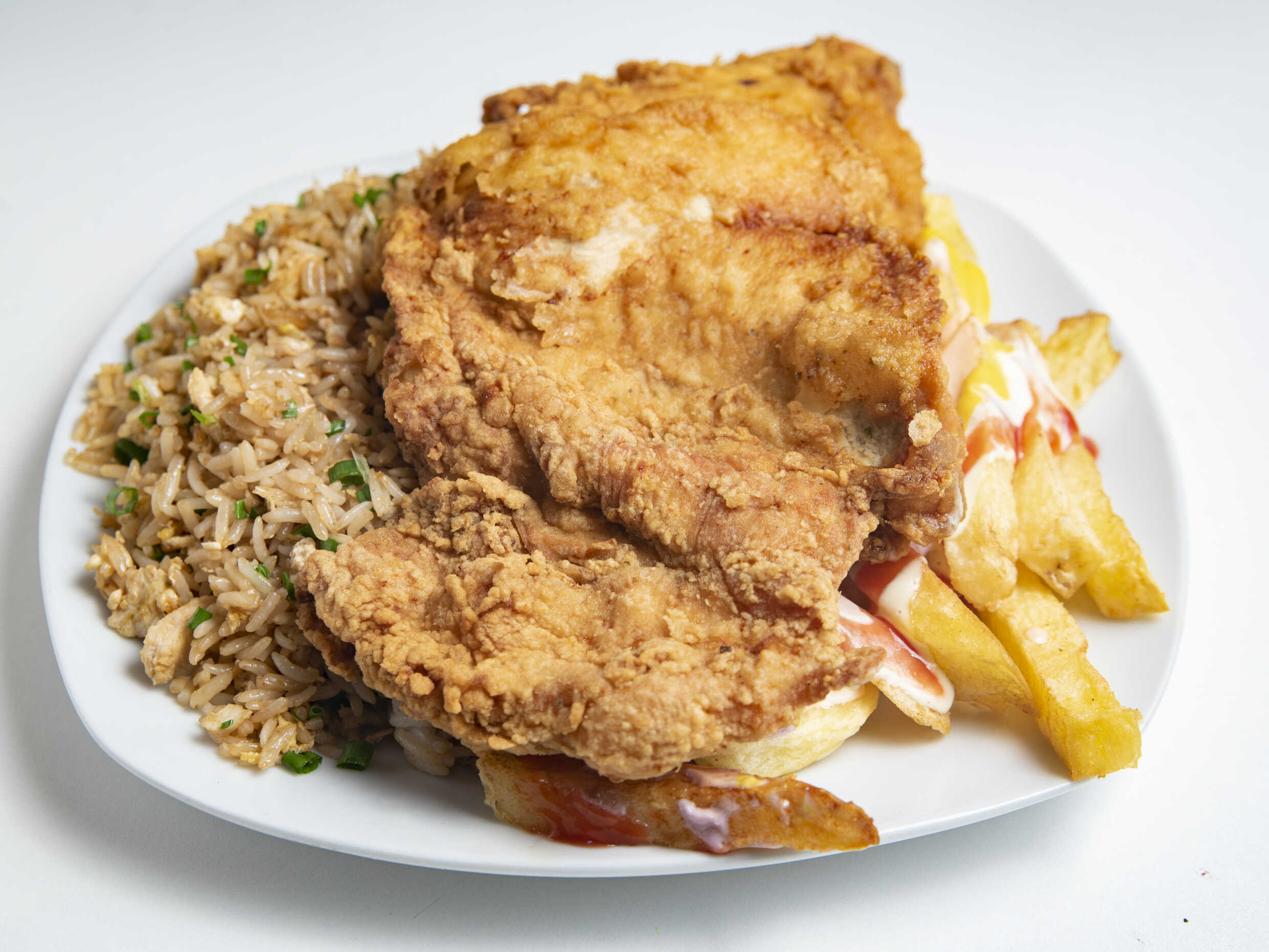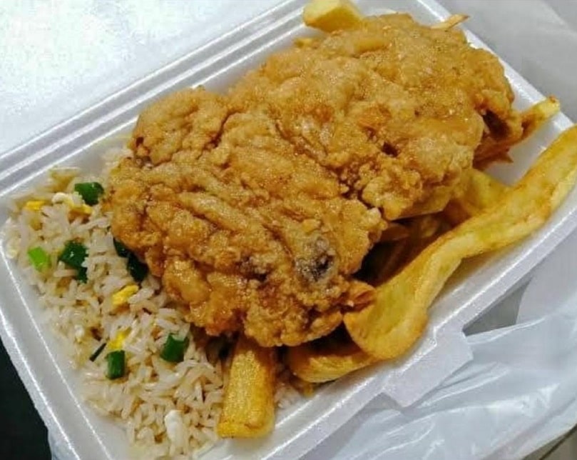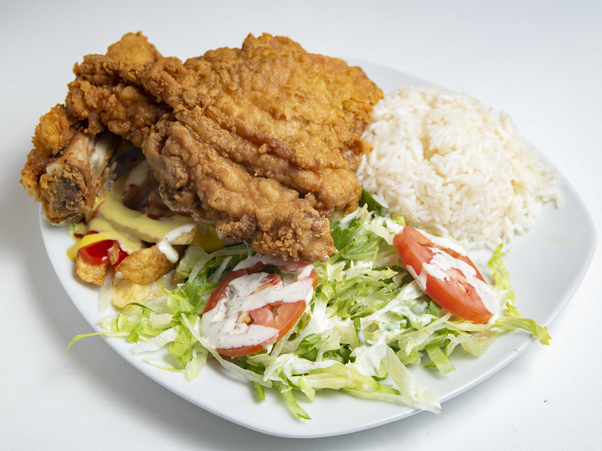 Acompañado de papas fritas, arroz chaufa y ensalada de lechuga.
