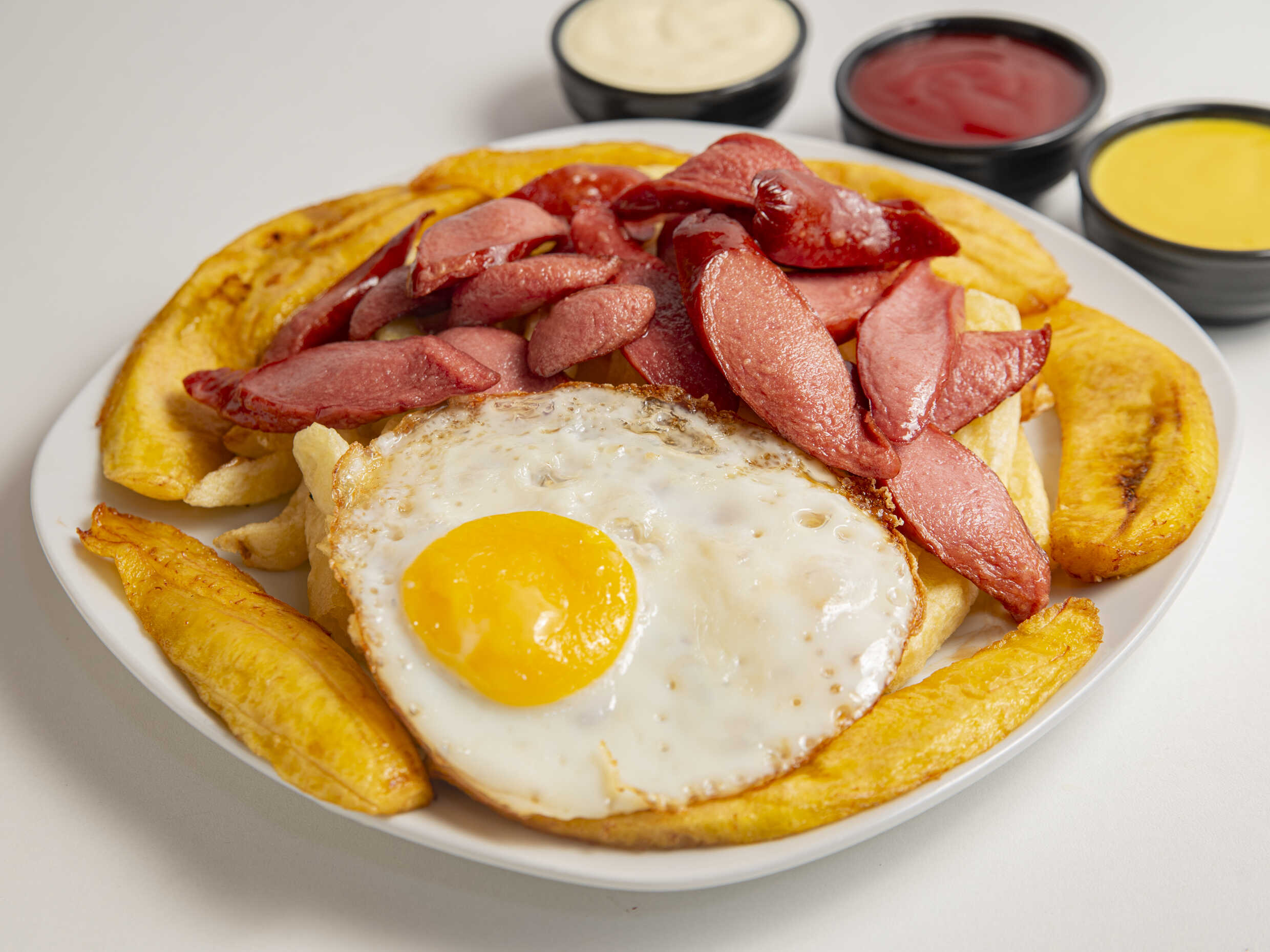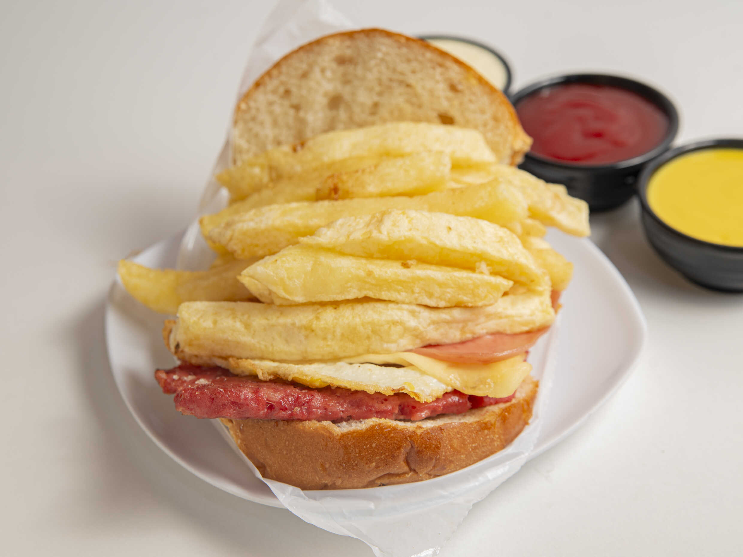 Acompañado de huevo, jamón, queso, papas fritas y ensalada.