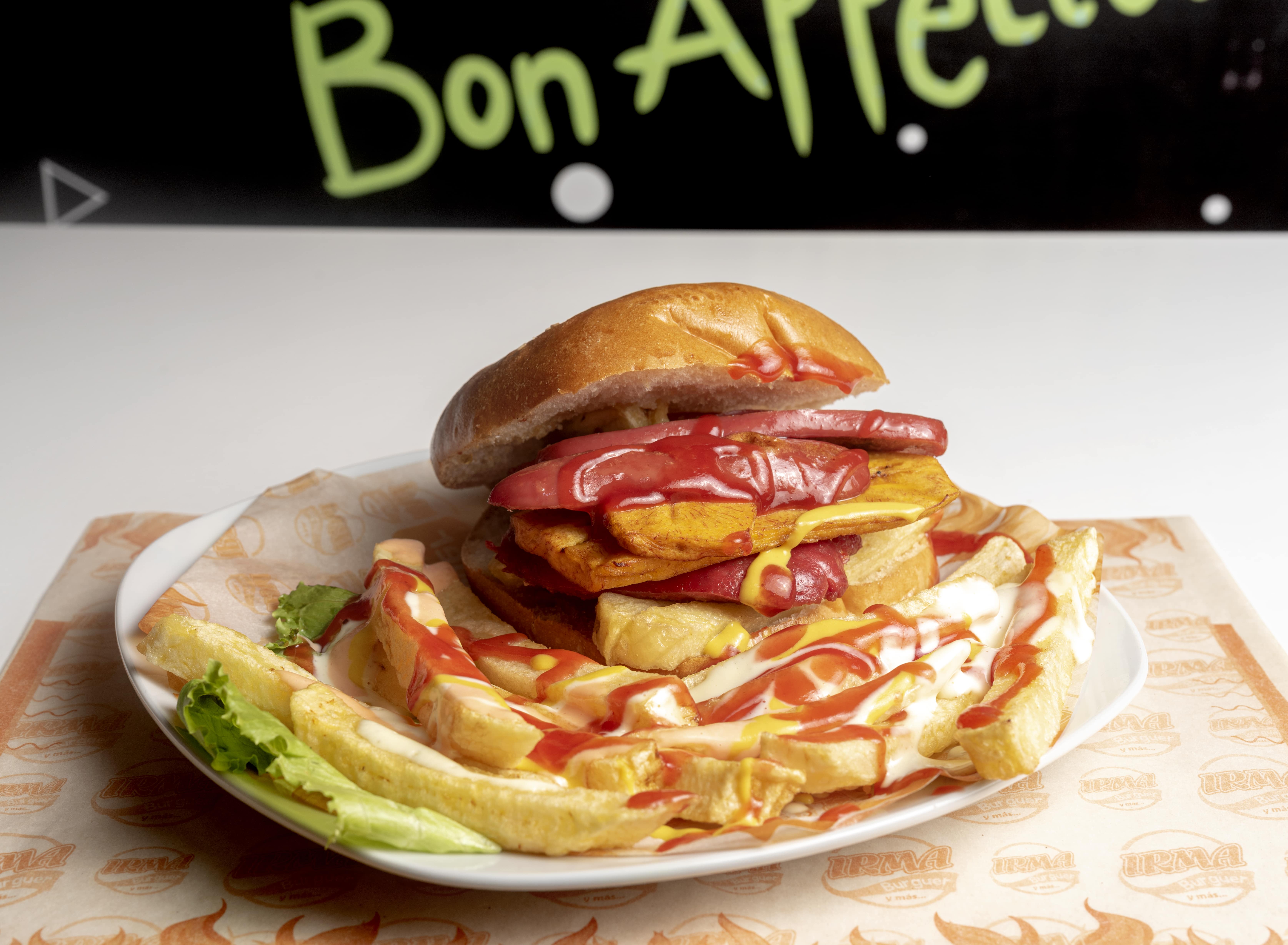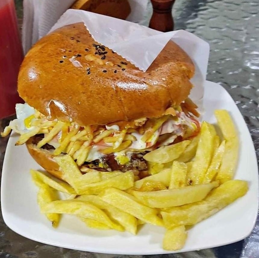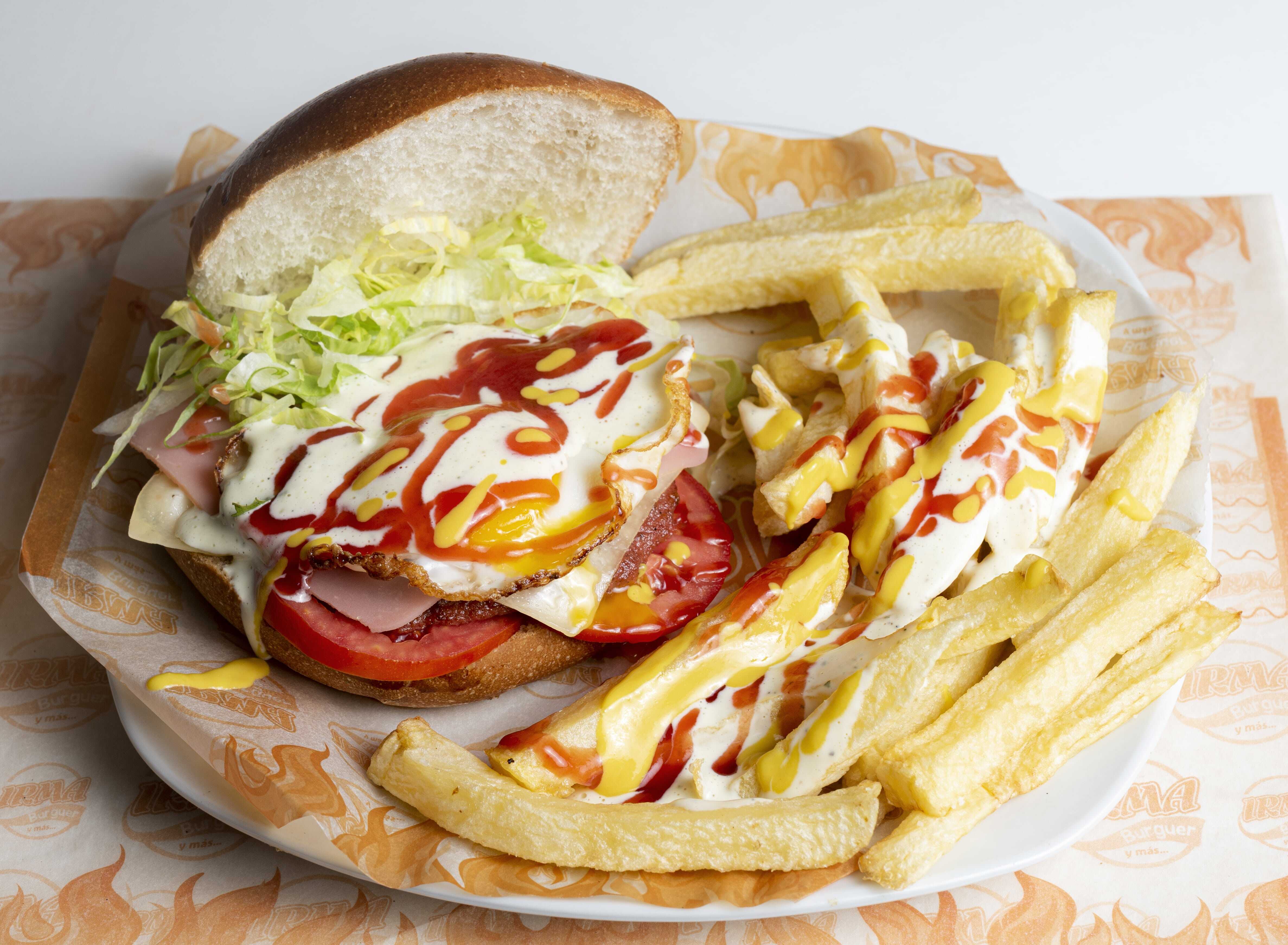 Hamburguesa de carne, acompañada de jamón, papas fritas, queso huevo y ensalada.