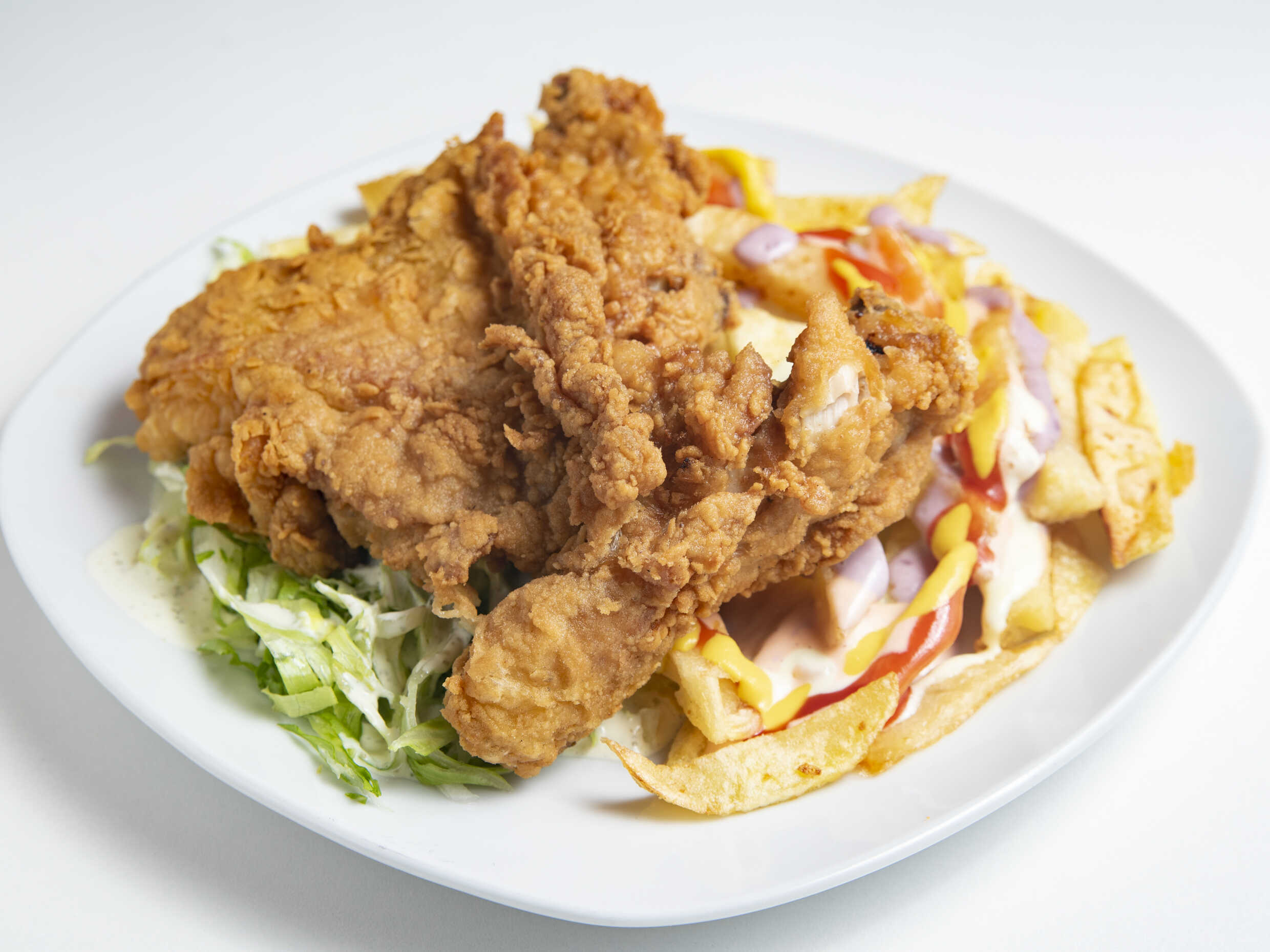Broaster acompañado de jamón, queso, huevo, papas fritas y ensalada.