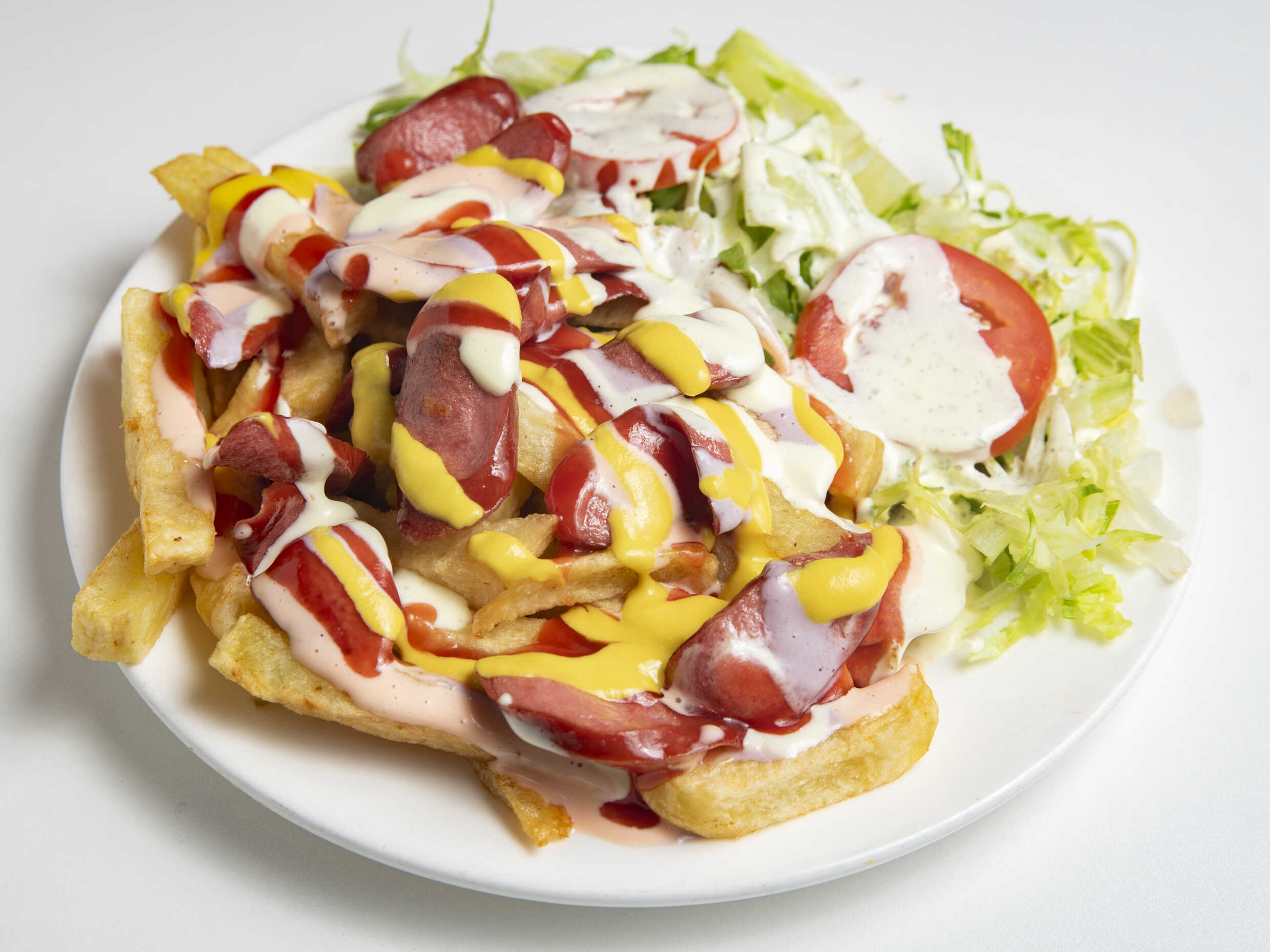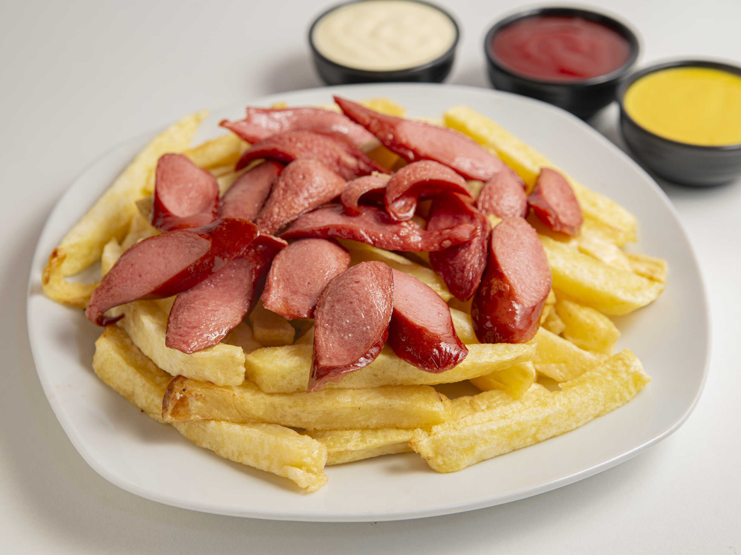Hot dog, chorizo, abundantes papas fritas y ensalada de lechuga.