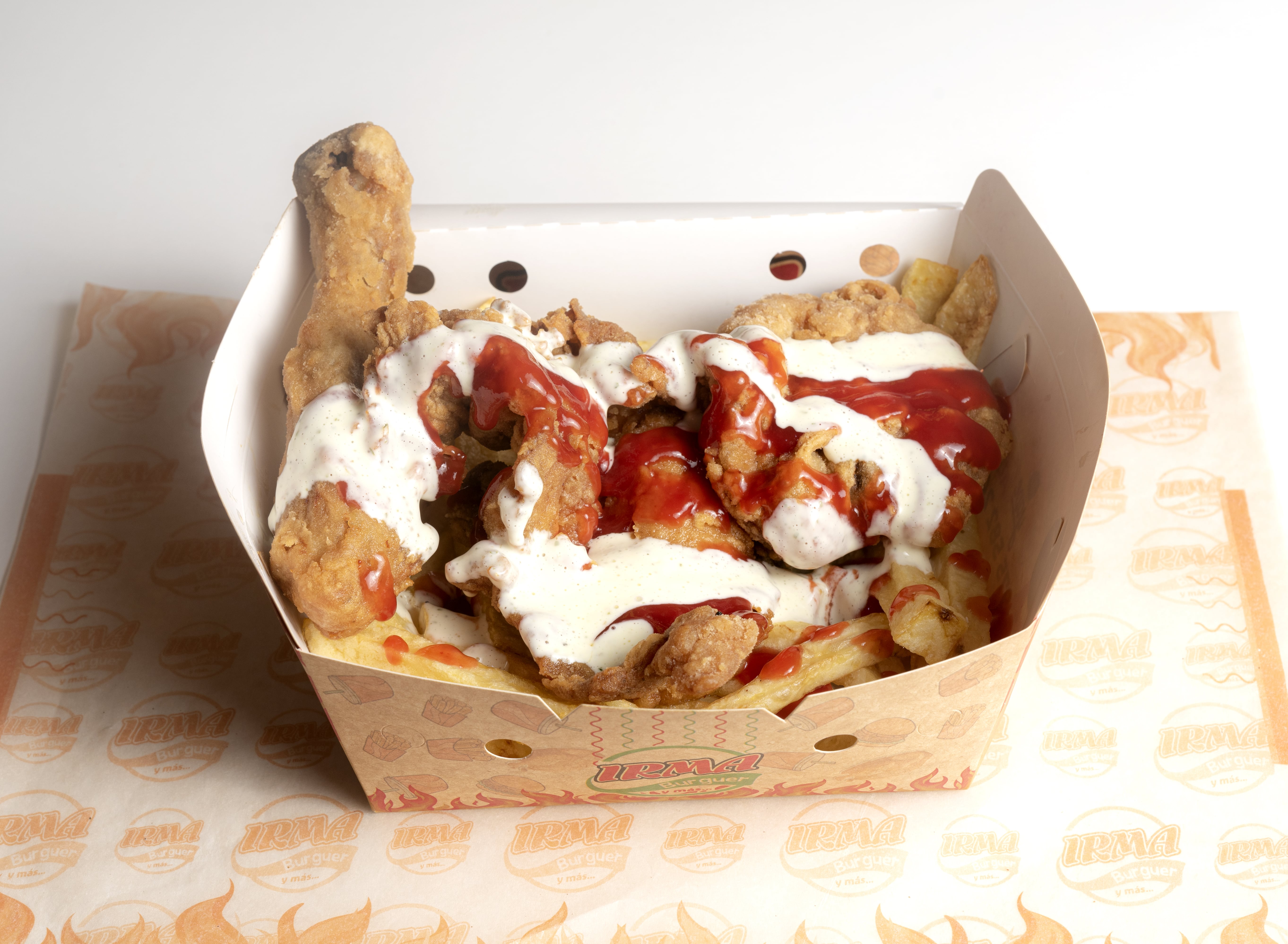 Hamburguesa de pollo doble, acompañada de doble queso, jamón, tocino, huevo, papas fritas y ensalada.