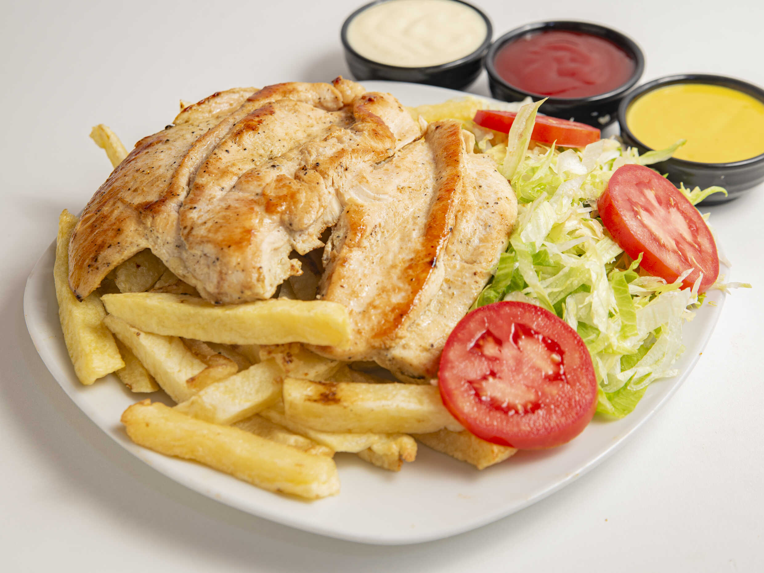 Filete de pechuga, abundantes papas fritas y ensalada de lechuga.