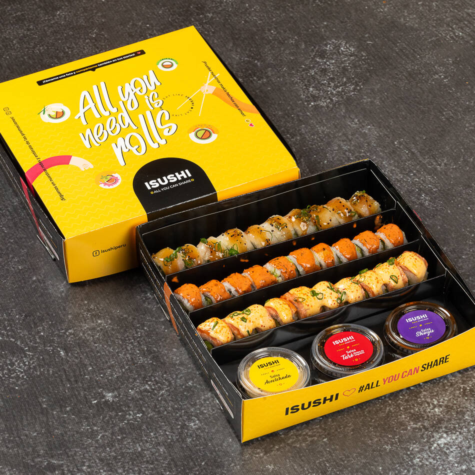 Disfruta de este box especial de 20 cortes de makis, 2 sabores a elección acompañado de 4 nigiris acompañado de nuestras 3 salsas (acevichado, shoyu y anguila).