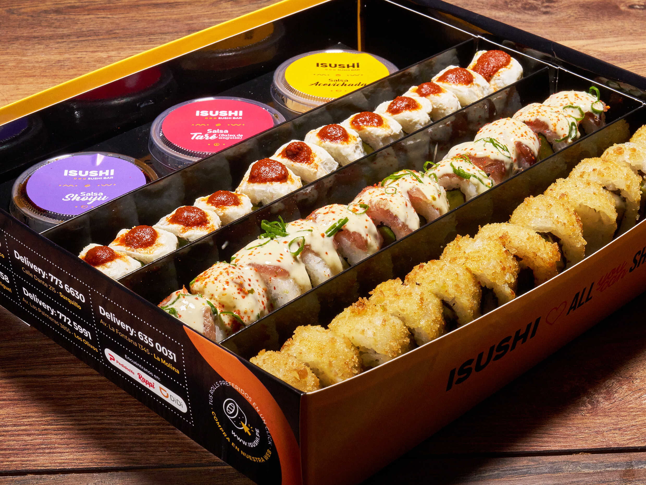 2 tablas de 12 makis acompañado de tu trío de salsas favoritas (acevichado, anguila y shoyu)