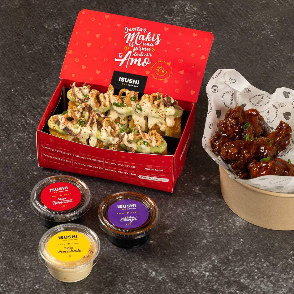 Elige 1 sabor de tus makis favoritos mas pack de salsas y 3 alitas.