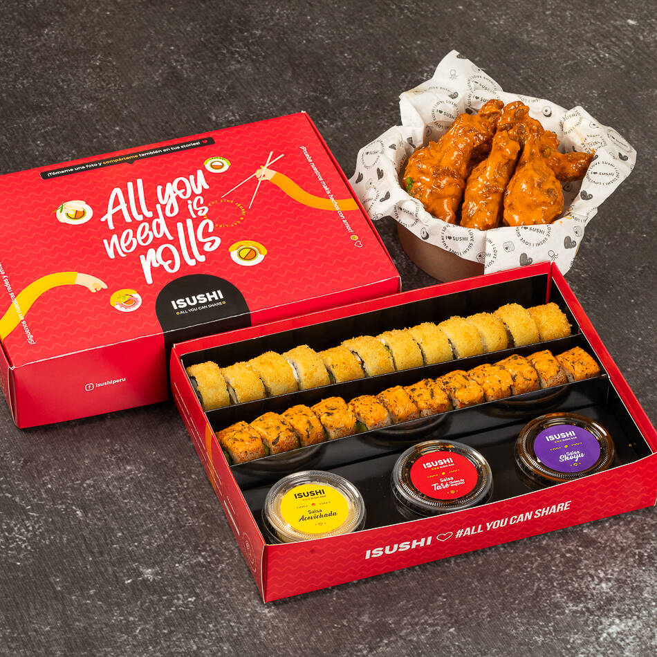 Disfruta de este box especial de 20 cortes de makis, 2 sabores a elección acompañado de 4 nigiris acompañado de nuestras 3 salsas (acevichado, shoyu y anguila).