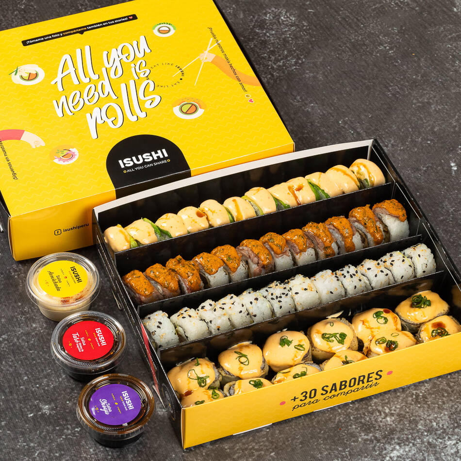 4 tablas de 12 makis acompañado de tu trío de salsas favoritas (acevichado, anguila y shoyu)