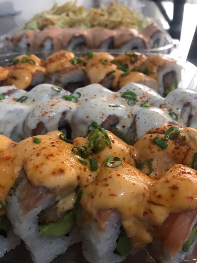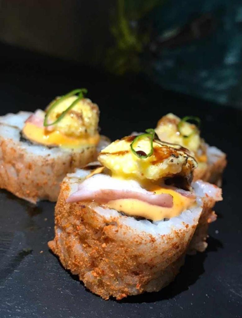 Relleno de ebi furai y palta, cubierto de sakana en salsa volcán, flameado y coronado con gotas de salsa tare más negi.