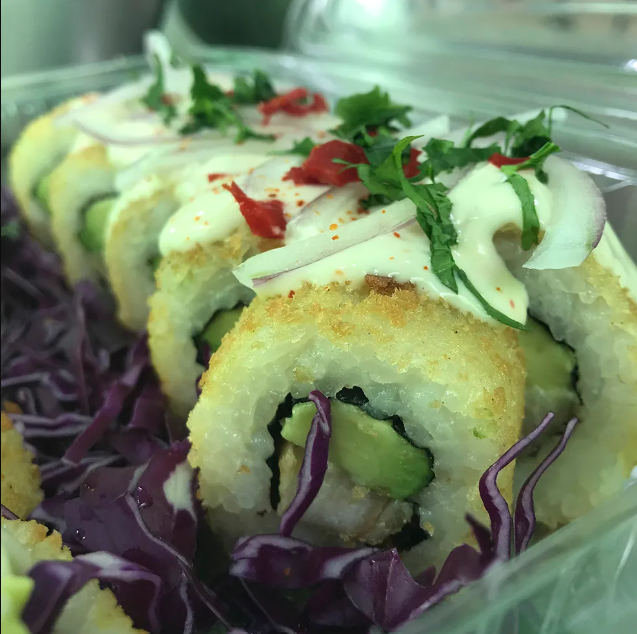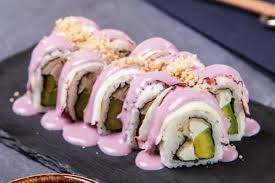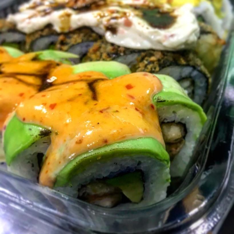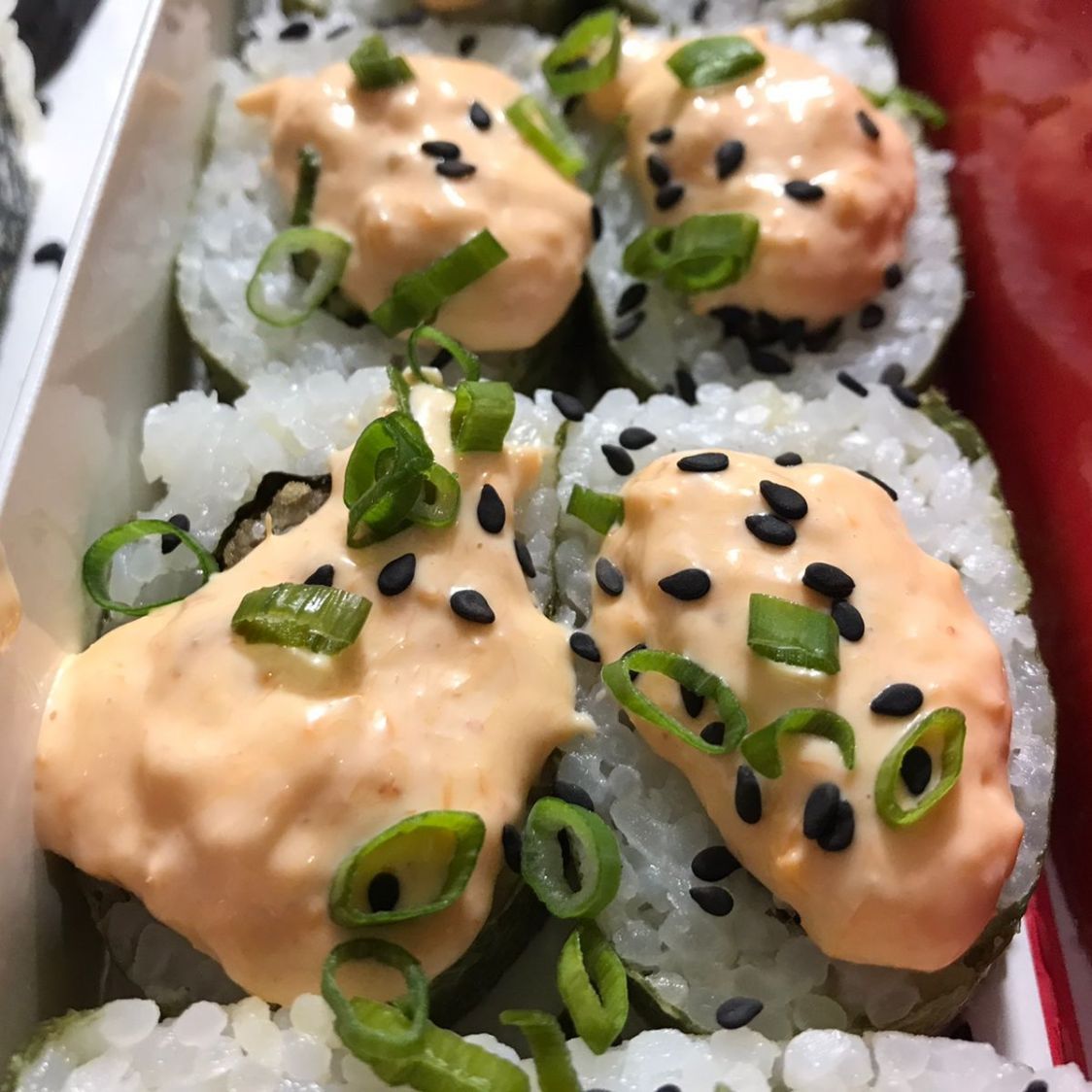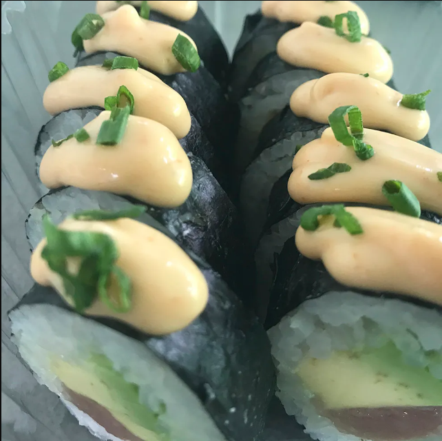 Relleno de bonito y palta, cubierto en alga nori con topping de salsa spicy ligeramente picante.