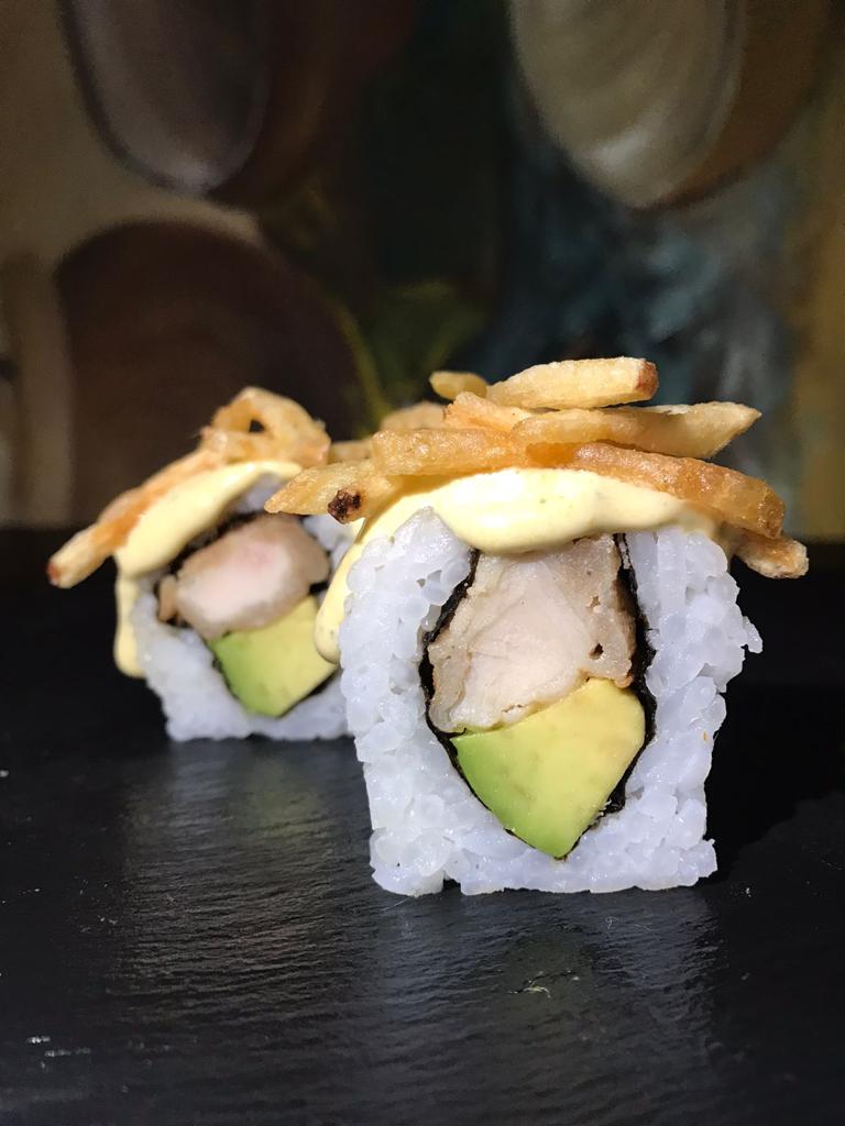 Relleno de pescado empanizado y palta, bañado en salsa acevichada con topping de chicharrón de pulpo.