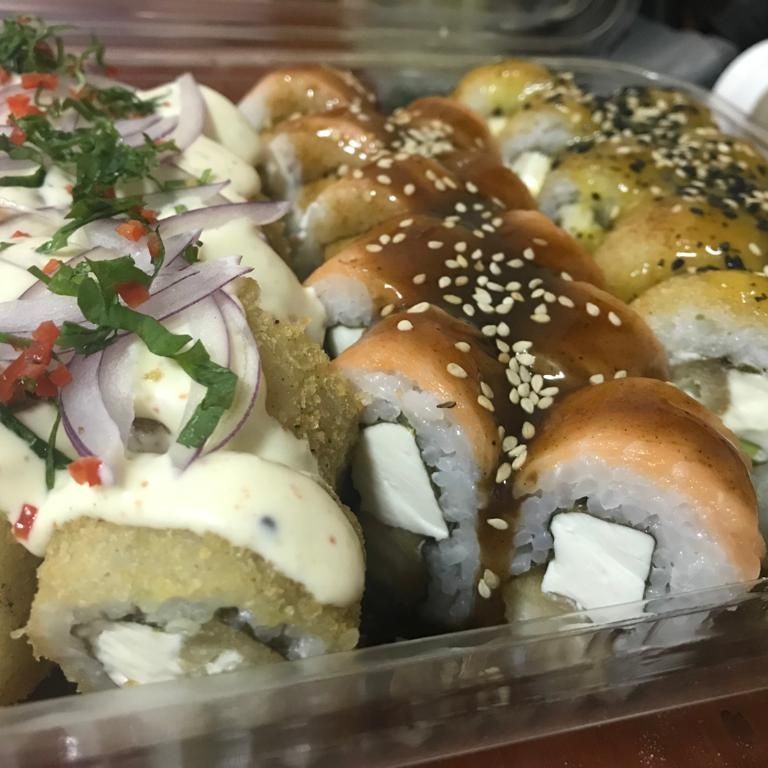 Relleno de langostino empanizado y palta, cubierto de trucha salmonada bañada en salsa imperial con toques de tare y topping de cebolla china más togarashi.