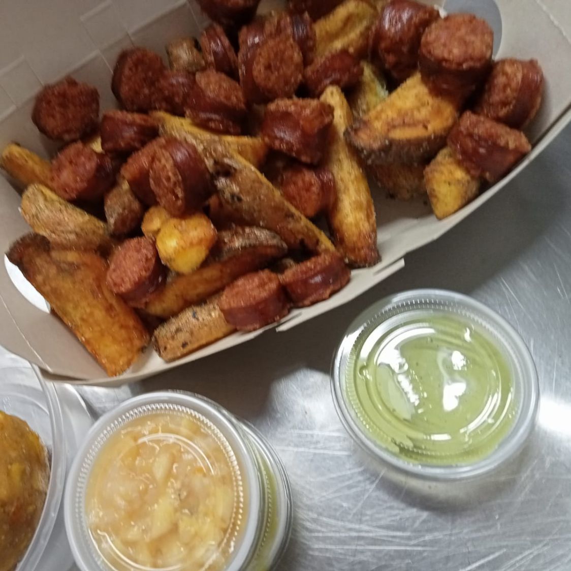 Salchipapa amazónica fusión con chorizo regional y papas nativas.