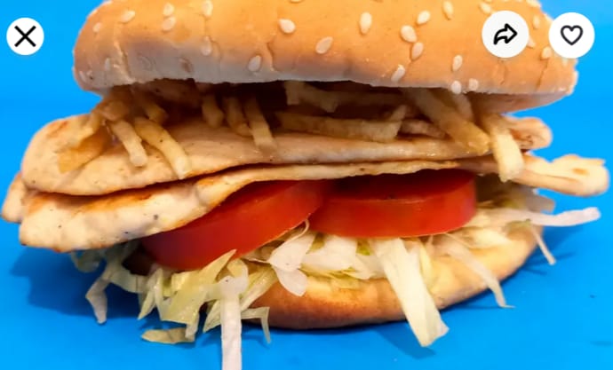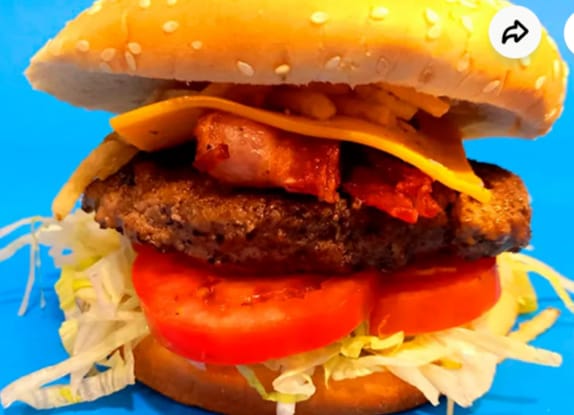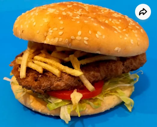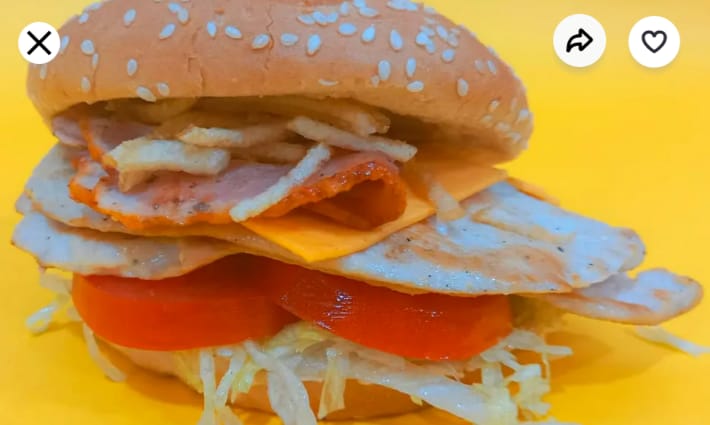 Pan, filete de pechuga, tomate, lechuga, queso cheddar, tocino, papas al hilo y cremas a elegir.
