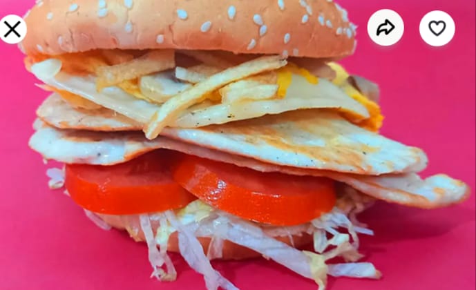 Pan, filete de pechuga, tomate, lechuga, omelette de champiñones y queso, papas al hilo, cremas a elegir.