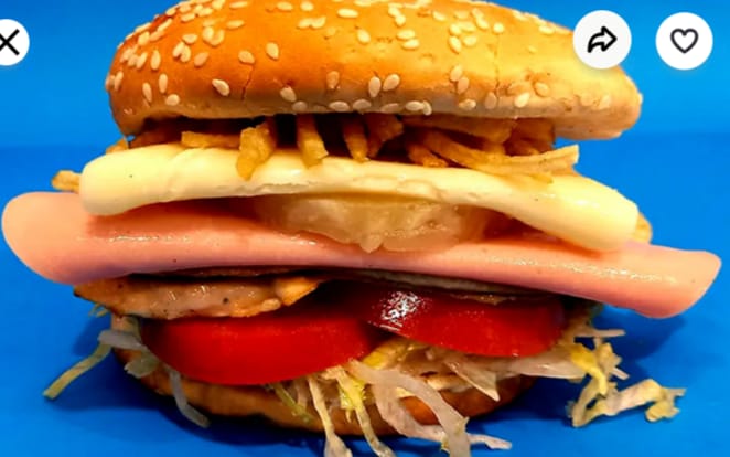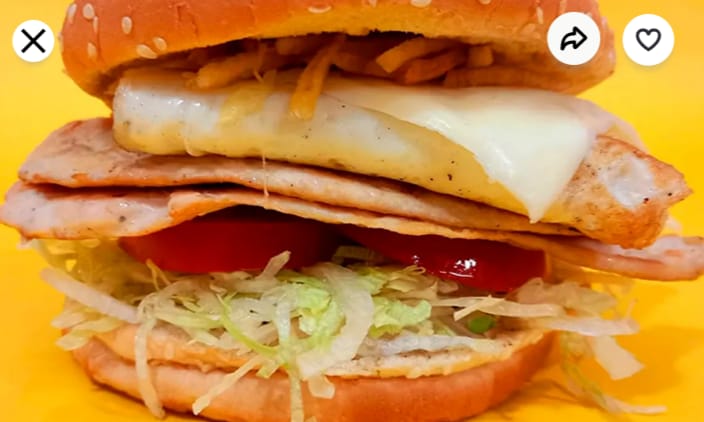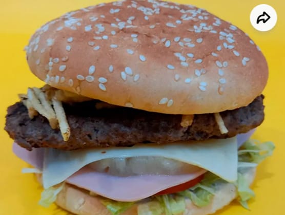 Pan, carne 200 g, tomate, lechuga, piña, queso edam, jamón, papas al hilo y cremas a elegir.